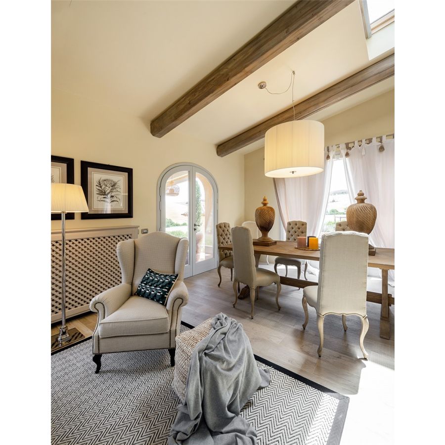 Strong of a great balanced aesthetic sense, this chandelier is composed of a chrome finish metal structure and a lampshade in ivory pleated fabric and complete with lower glass diffuser. Available in various colors.