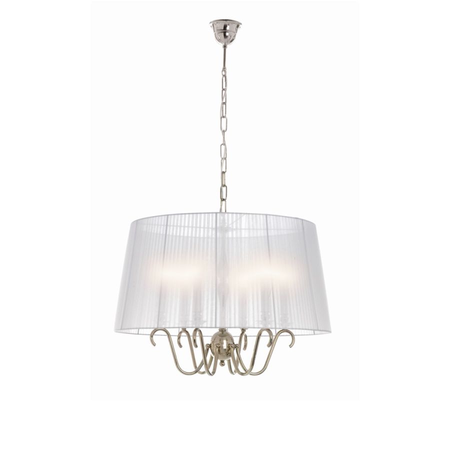 This particular model comes with 6 light points and a cylindrical lampshade in white pleated fabric, with a brass structure with a glossy nickel finish. Available in various finishes.