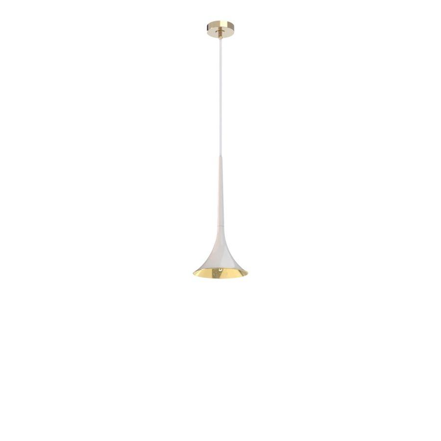 This contemporary style suspension model, designed for bedrooms and common areas, is composed of a structure and a ceiling fixing base in metal in a light gold finish. With transparent electrical cables.