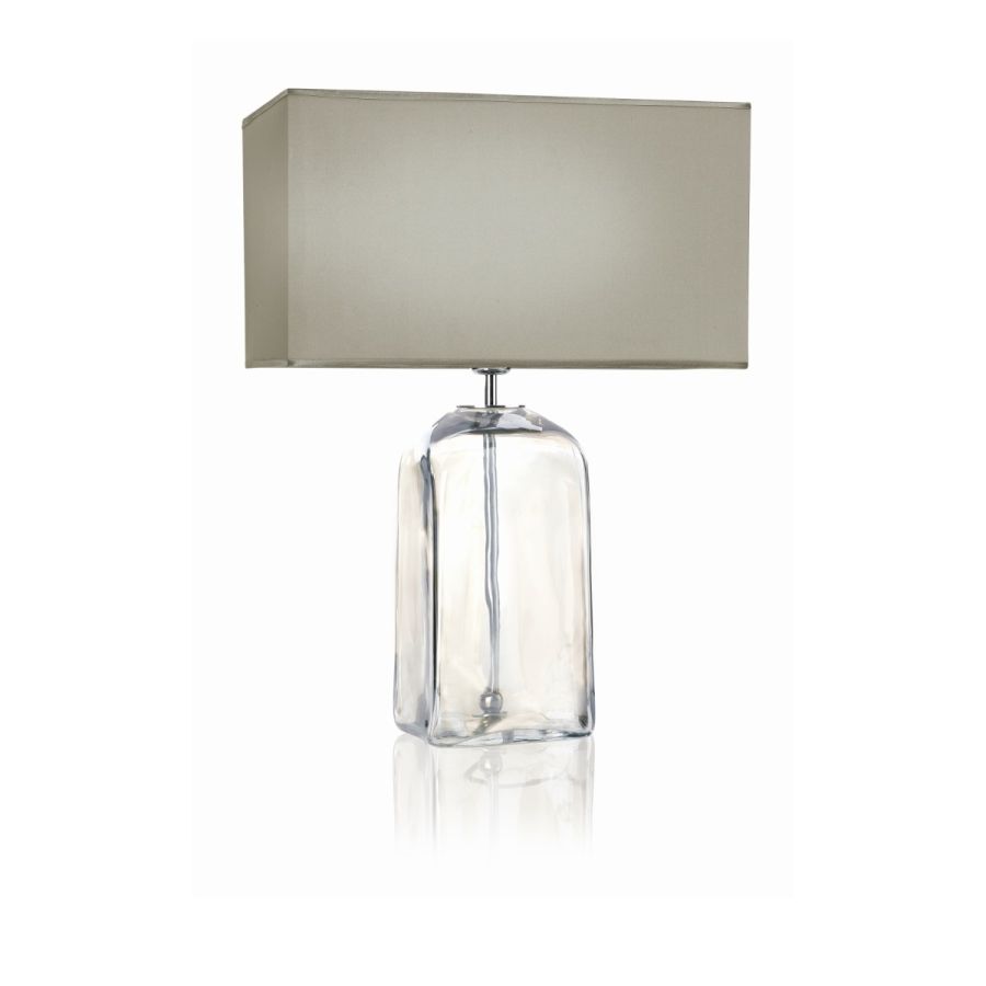 This lighting item is made with a central body in transparent glass, which shows the metal details in a chrome finish inside. To complete a rectangular lampshade in ivory fabric.