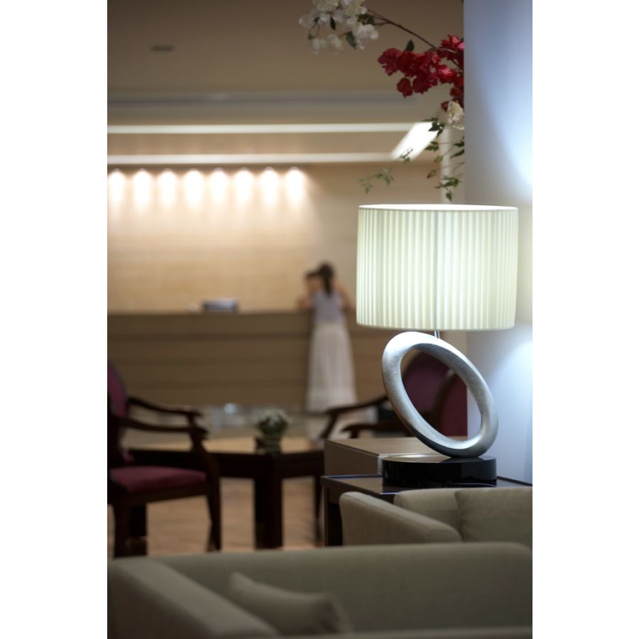 The result of a project aimed at enhancing the aesthetic beauty of the interior, this table lamp is made up of an asymmetrical ring structure in decorated wood, with details in a chrome finish and a cylindrical lampshade in ivory pleated fabric.