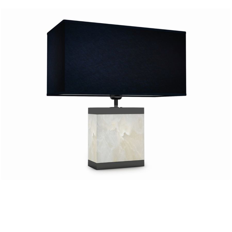 Its composition with onyx base and details in brass in black nickel finish and rectangular lampshade in black fabric, creates a contrast of colors and a harmony of shapes that enhance the component with a valuable and captivating aesthetic. Available in various colors.