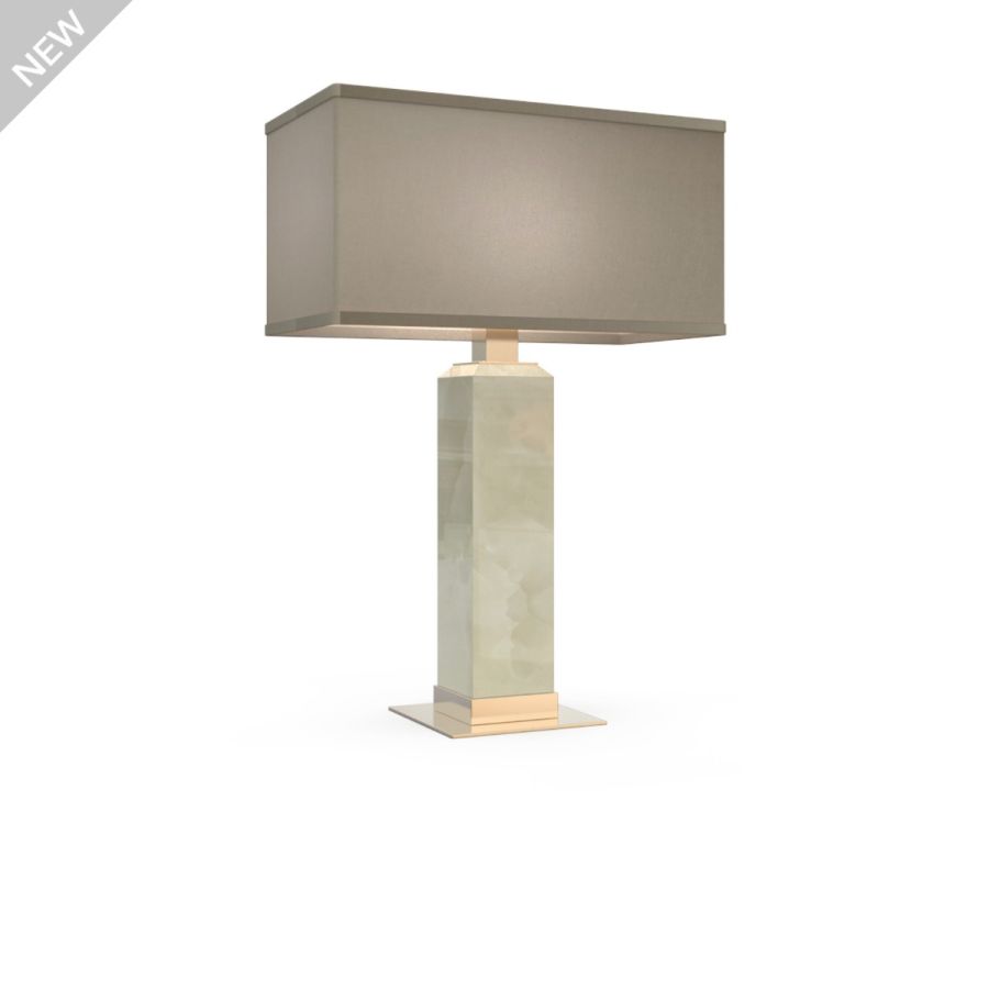 Its composition with base in onyx marble with light gold details and rectangular lampshade in hazelnut fabric, creates a harmony of shapes and colors that enhances the elegant and precious aesthetics. Available in various colors.