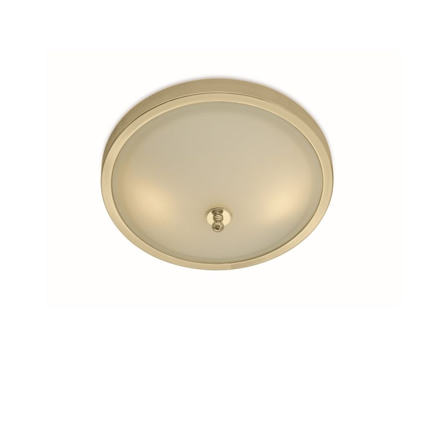 This round-shaped ceiling lamp model is presented with a frame and details in light gold-finish brass and completed by a frosted glass. The ceiling lamp is also available in other finishes.