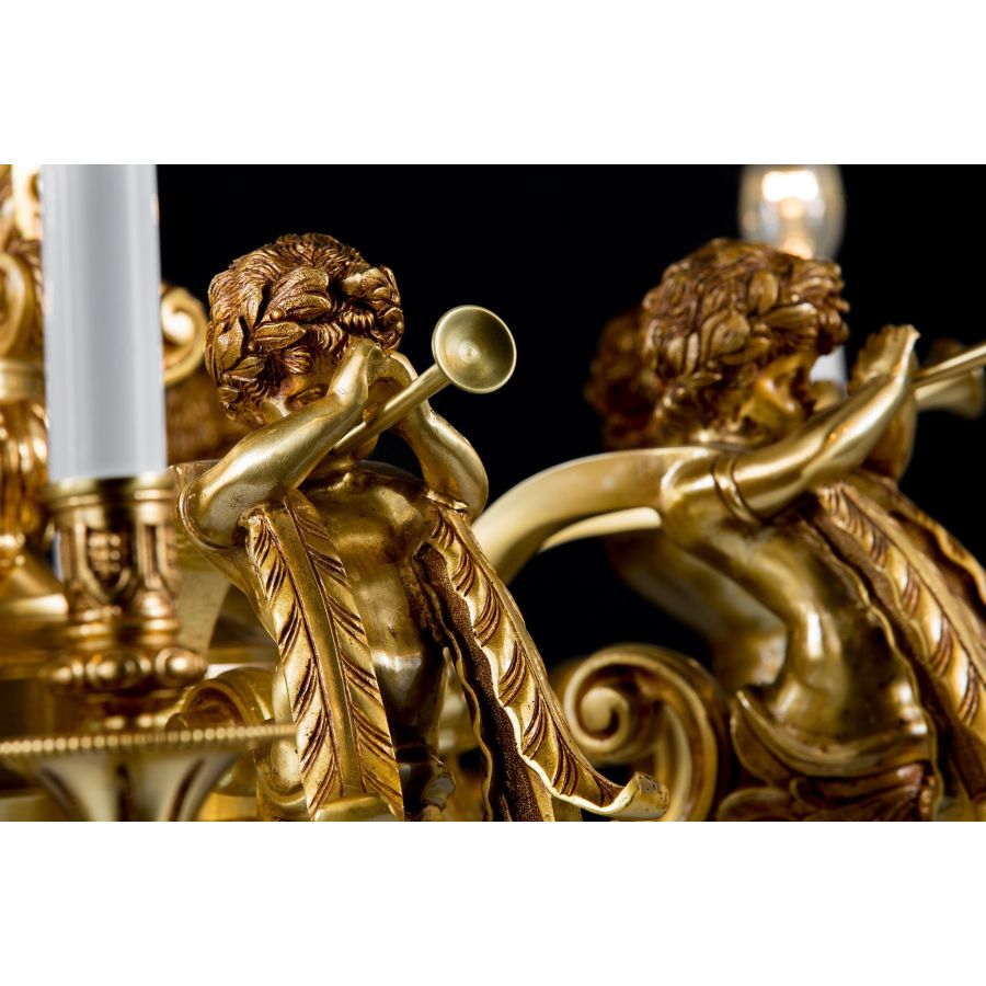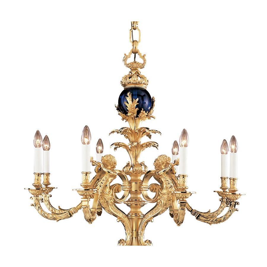 Żyrandol ma w centrum niebieską kryształową kulę, zwieńczoną wijącymi się liśćmi, poniżej znajdują się cztery amorki dmące w róg.