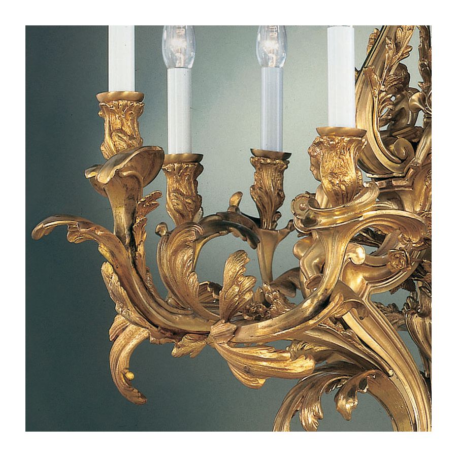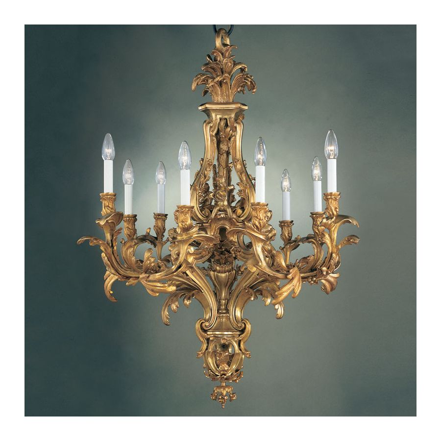 Wspaniały, dziewięcioramienny francuski żyrandol rokoko ma trzon w kształcie wazy, z którego wychodzi seria zakrzywionych ramion o różnej wielkości. Zarówno waza, jak i ramiona są bogato zdobione asymetrycznymi motywami wolutowymi, kwiatami rocaille i liśćmi. Stworzony przez Jacques’a Caffieri, francuskiego rzeźbiarza, w 1751 roku, wykonany z pozłacanego brązu i metodą „odlewu woskiem traconym”, każdy z tych żyrandoli jest unikatowy. Oryginalny żyrandol można zobaczyć w Bibliotece Mazarino w Paryżu.