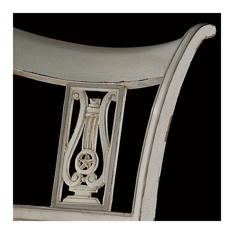 This chair is characterised by the scrolling of the back upright, its pierced panel in the centre of the back and its straight, tapered front legs. The lyre and star dear to Directoire style ornament the openwork centre splat.