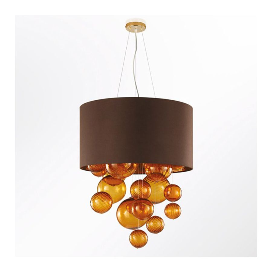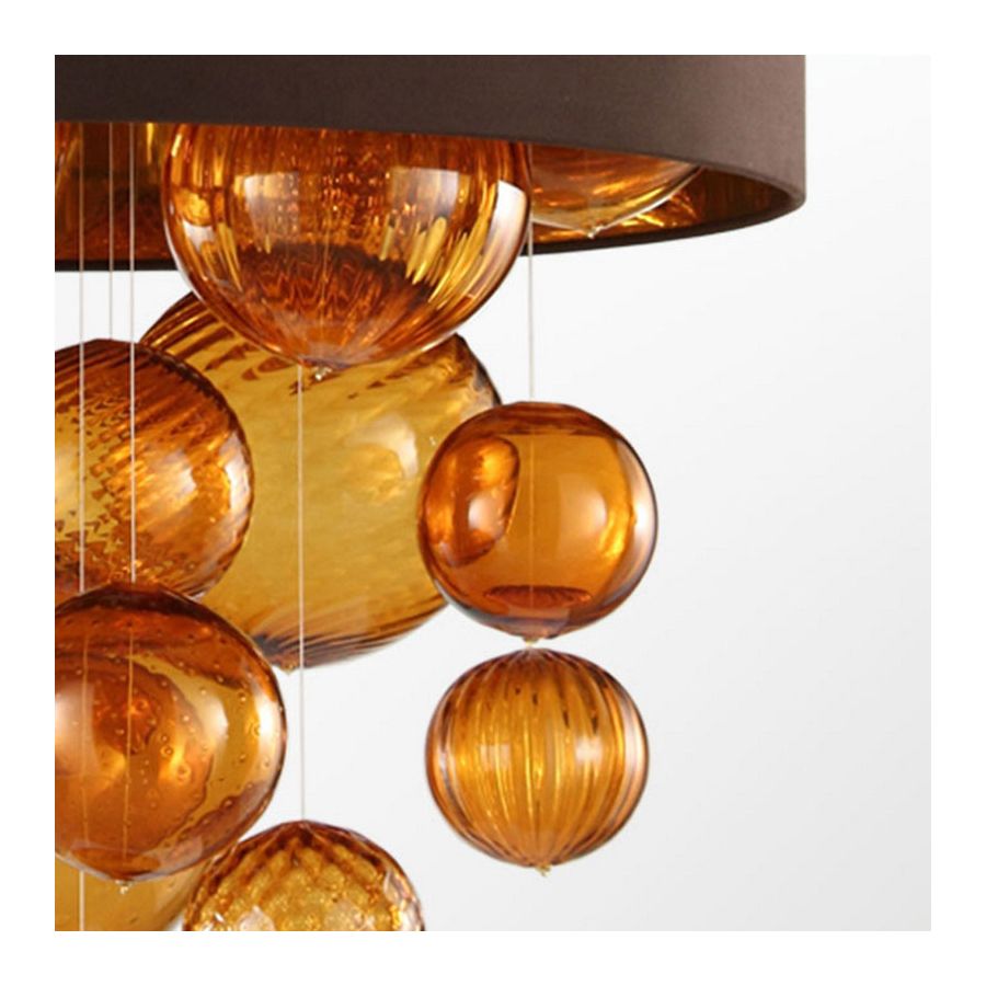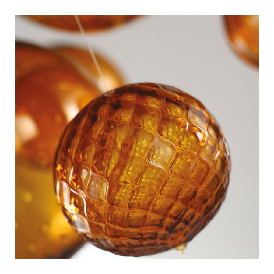 From inside this large round structure, a group of glass spheres of different sizes goes down. This spheres have been decorated using various techniques, such as the “baloton” and the “rigadin” techniques. The thin wires that support the spheres are almost invisible, so that the spheres seem to float under the lampshade.