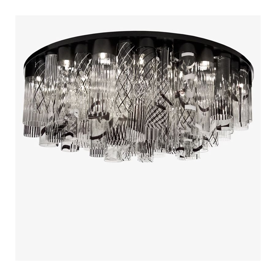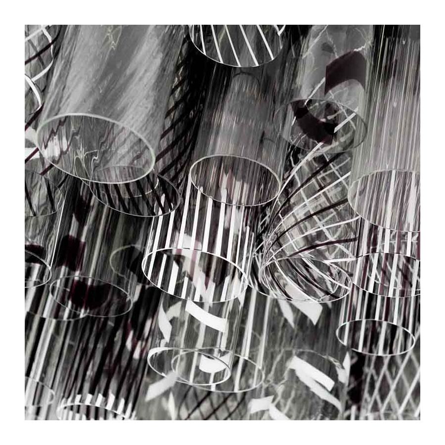 This modern lighting fixture is characterized by a wide variety of decorations on the glass of the tubular elements; these are the decorations typical of the glass objects (such as glasses, vases, etc.). Here the purpose of MULTIFORME has been that of decorating in details each element of the lamp. In the multitude of elements and decorations, the coloration gives uniformity to the structure: all the decorations are made in black and white on crystal glass.