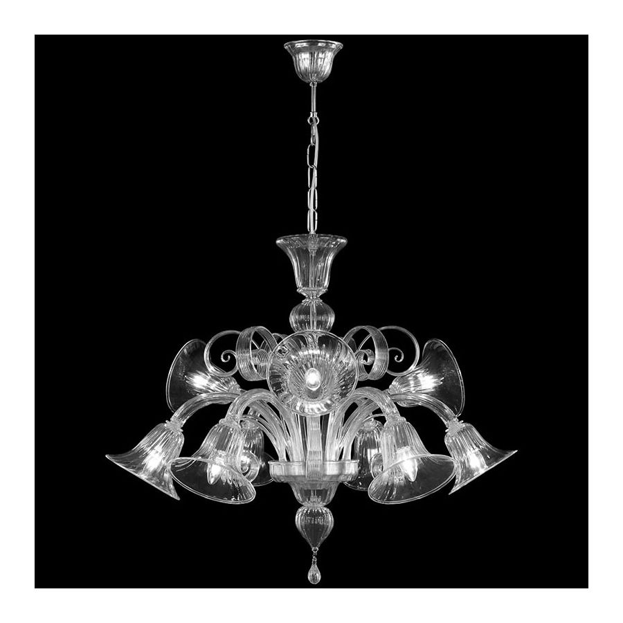 The blown glass chandeliers collection Capriccio 560 has the position of the lights, which are downwards. It is the best solution when the ceiling is not very high, without renouncing to the elegance and the magnificence of a venetian chandelier. As in many other collections by Multiforme, not only the structure but also the colours are innovative.