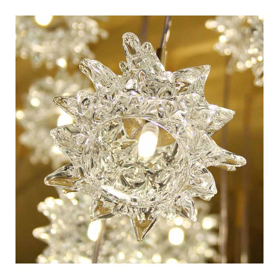 The resulting elements thus remind the shape of a crystallized spark. A peculiar technique, made even more evocative by the little lights inserted inside each glass element, that enhance the sparkling effect.