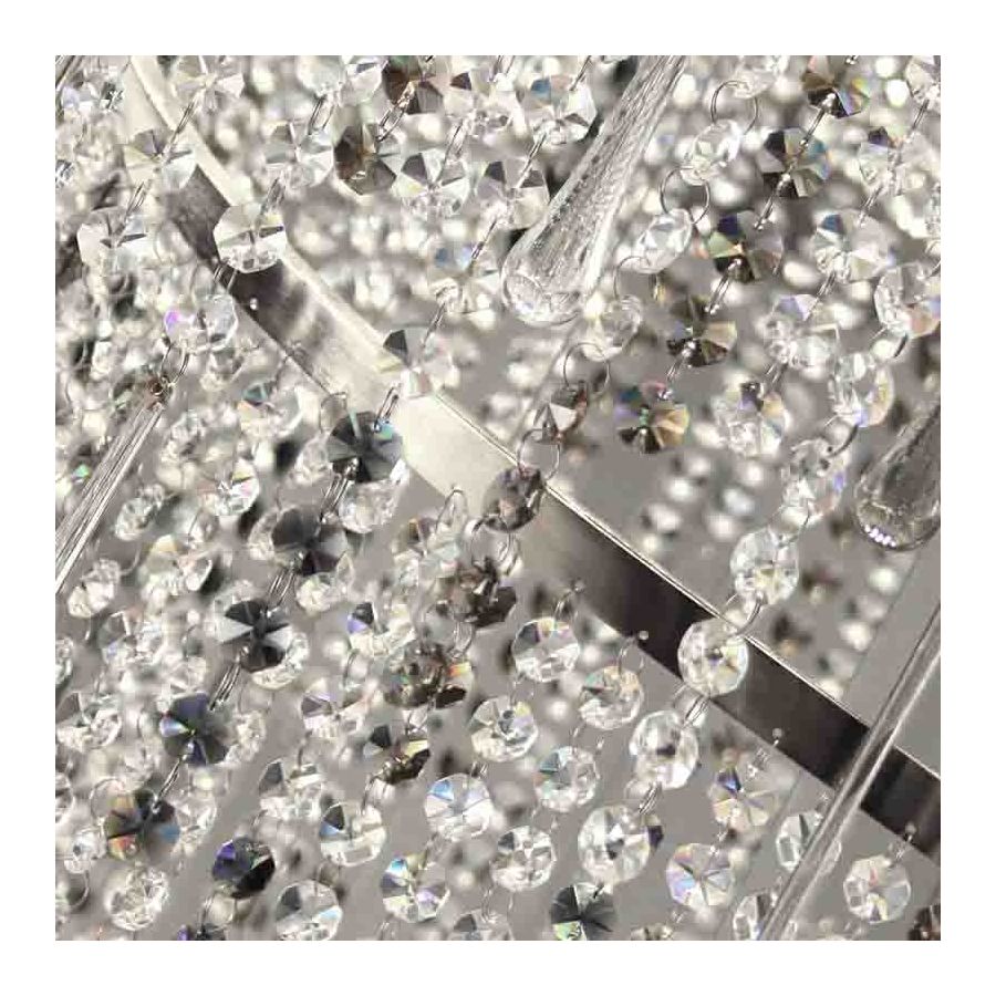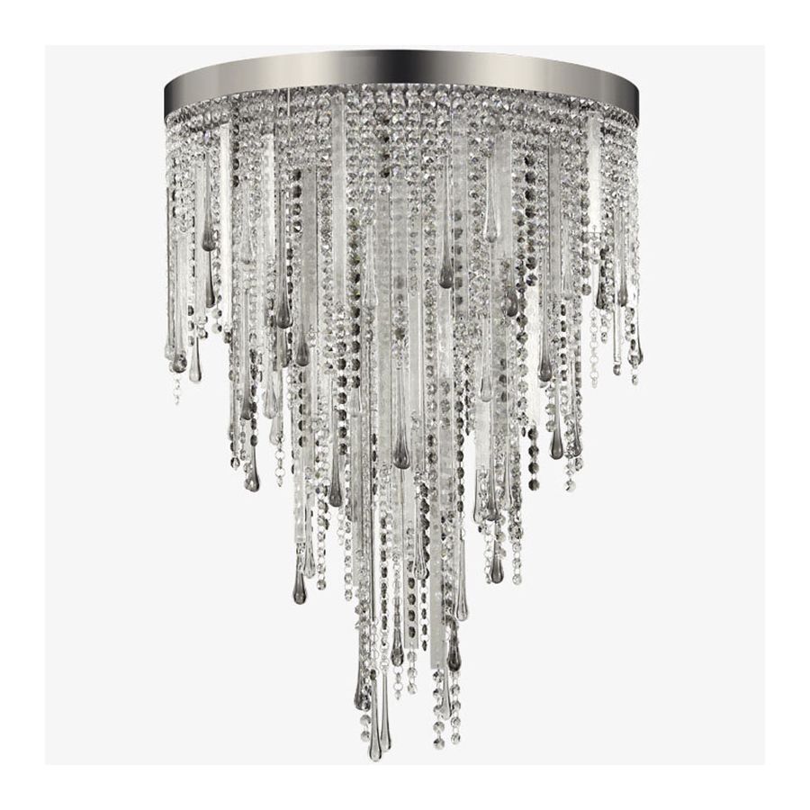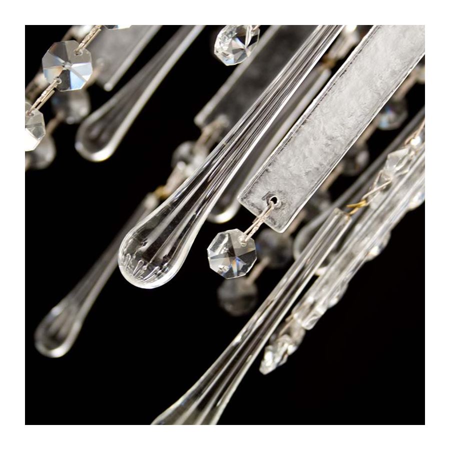The light, that comes out passing through the pendant elements, creates a multitude of glares in the surrounding space. This is a real jewel-like chandelier, completely covered by tiny Murano glass and crystal elements. This elements have been fixed on a neutral structure that disappear below the cascade of decorations.