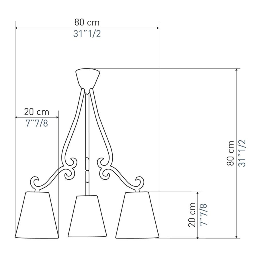 Width: 80 cm, Maximum: 3 x 60 w, Les Abat-jours peuvent être fabriqués dans 18 coloris au choix, The colour for the shades can be chosen out to 18 different hues