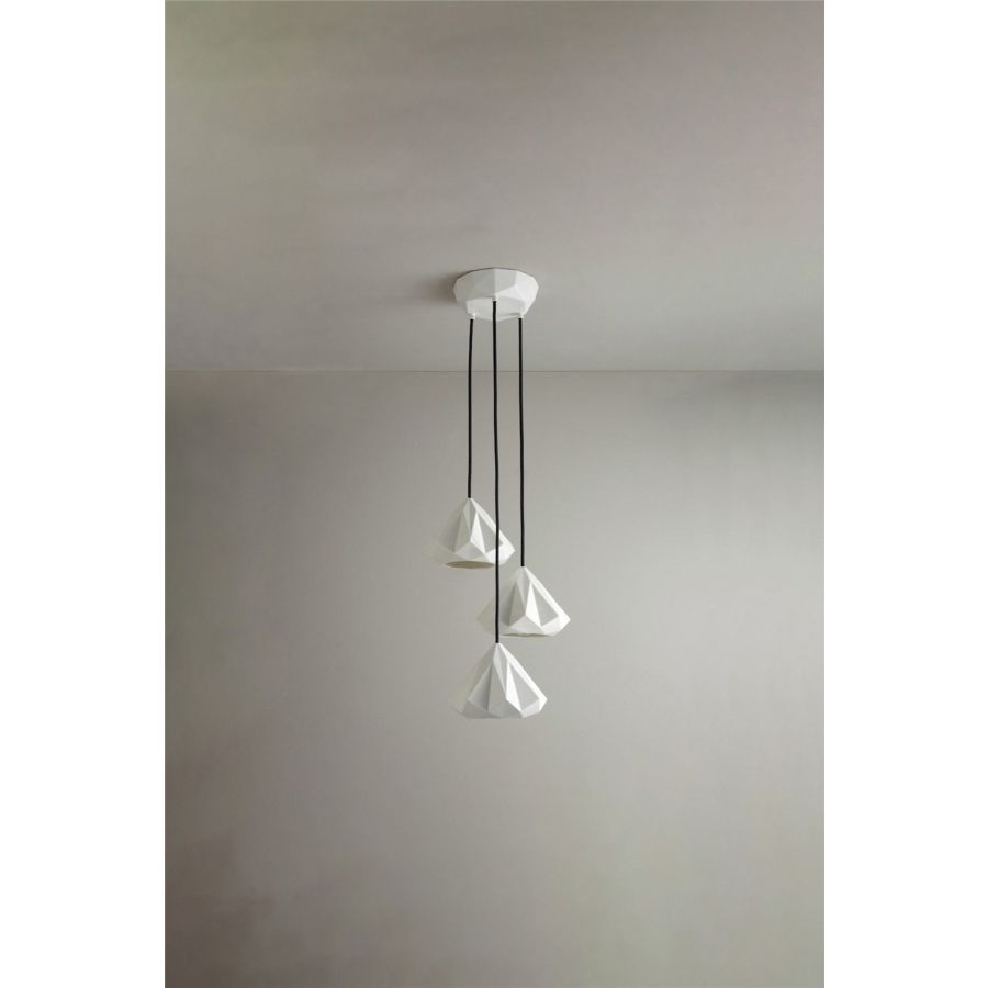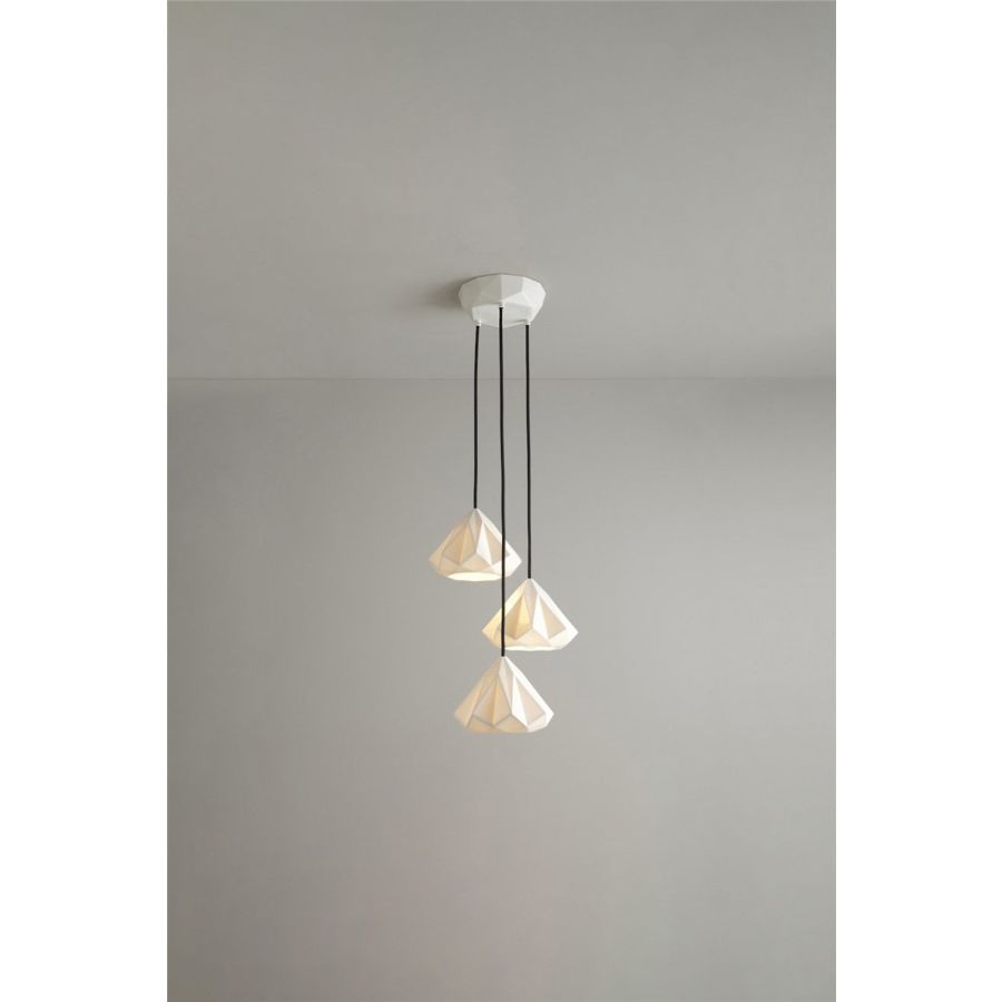 The Hatton 1 Grouping of Three Pendant is a truly iconic statement piece. Using a highly skilled process, we have been able to transform the bone china shade into an intricate, multi-faceted, gem-like form. When switched 'off' the pendant has an angular sculptural beauty, and when 'on' it provides warm illumination with dramatic lines and shadows.
