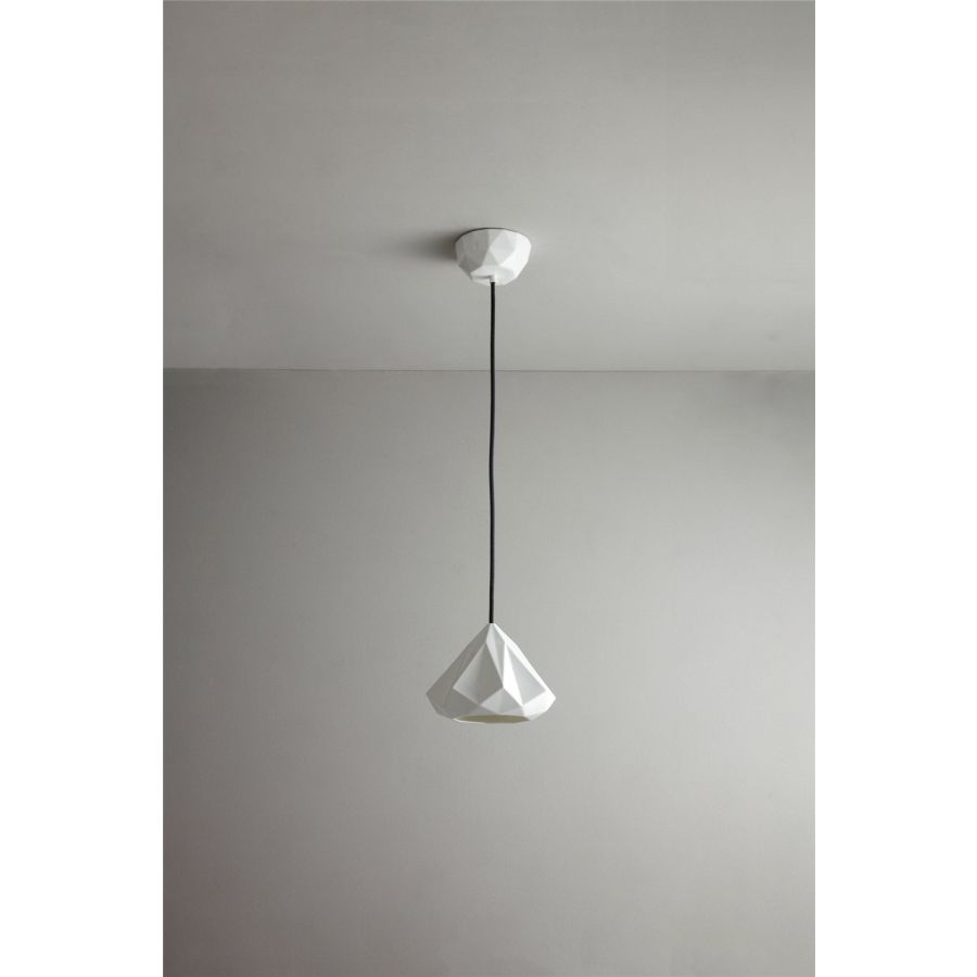 The Hatton 1 Pendant has a beautifully intricate bone china shade. Using a highly skilled process, we have been able to transform bone china into a multi-faceted, symmetrical, gem-like form. When switched 'off' the pendant has an angular sculptural beauty, and when 'on' it provides warm illumination with dramatic lines and shadows.