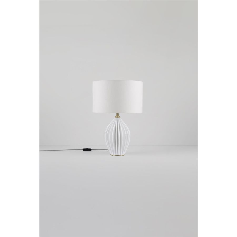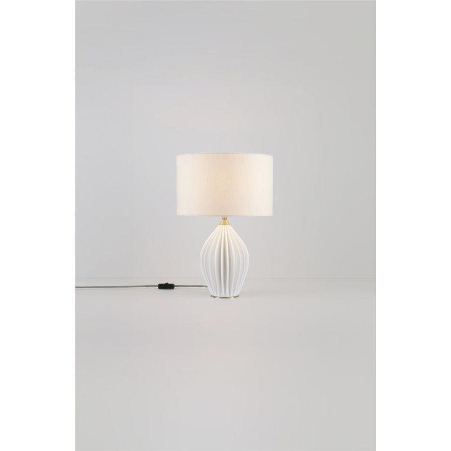 The Fin Queen Table Light marks a new direction for Original BTC, combining our trademark bone china with the addition of a drum shade. The ivory linen shade casts a soft, diffused light, creating beautiful shadows on the intricate hand slip-cast base. The Fin is finished with lacquered, brushed solid brass details and signature cotton braided cable in a pale grey, while the shade sits on an angleable ball and socket to facilitate reading.