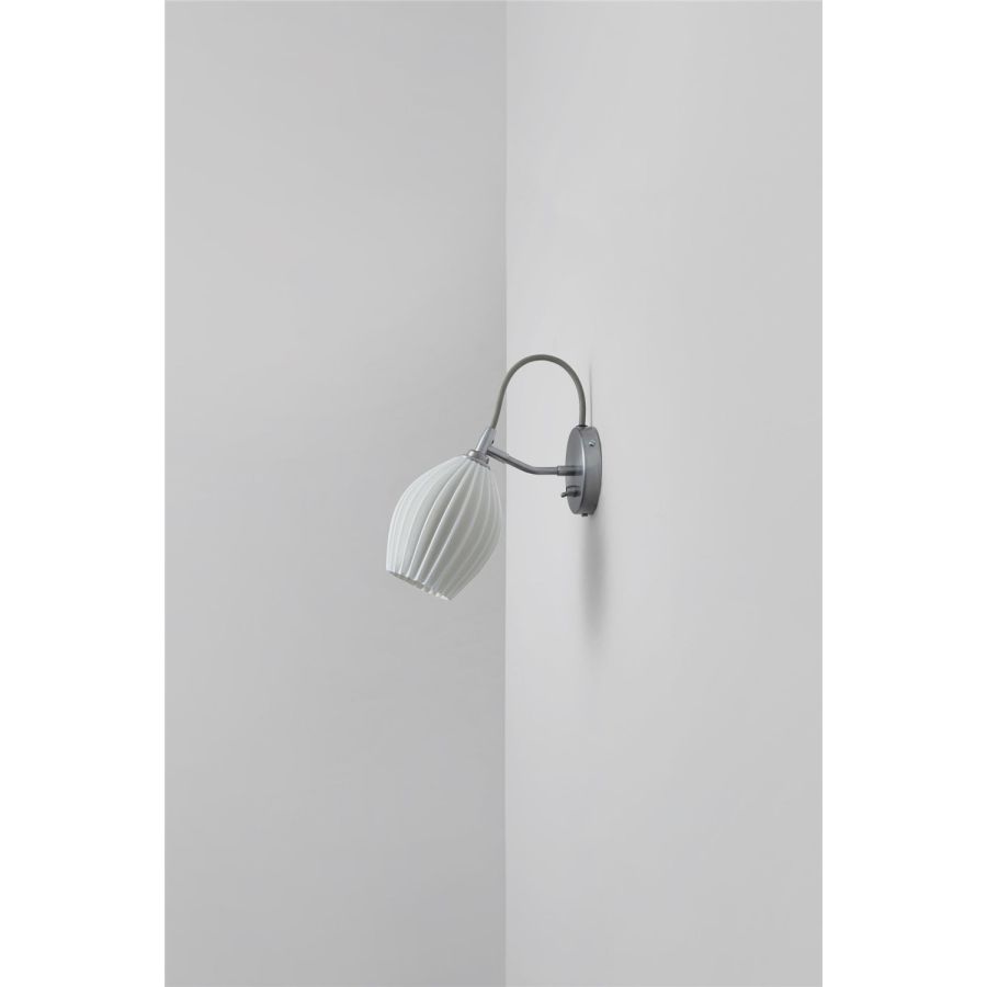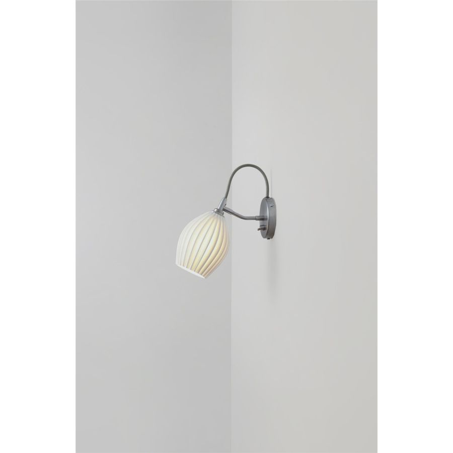 The Fin, with its eye-catching bone china shade, expertly moulded into intricate organic shapes, creates dramatic light when lit and retains a sculptural beauty when off. Handmade in Stoke-on-Trent, its distinctive shade is angled onto a satin chrome back plate. The new grey cotton braided cable complements the style beautifully.