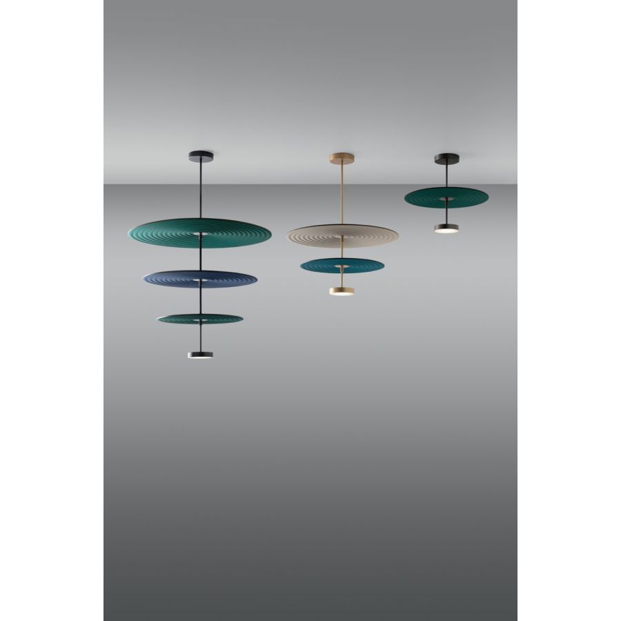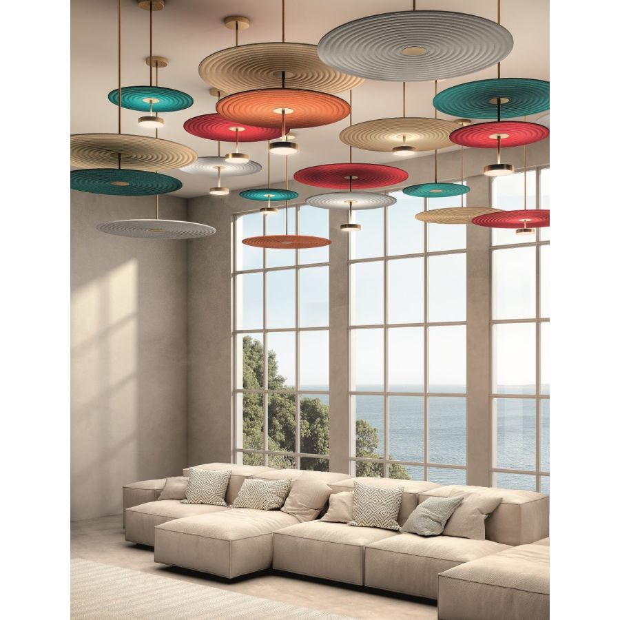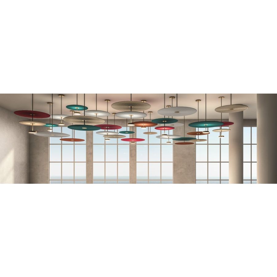 Modular suspension with metal structure in three sizes, available in gold and black matt finishes. Sound-absorbing fabric discs are available in three diameters in the following colors: bordeaux, dark blue, petroleum, brick, sand, light grey, dark green.