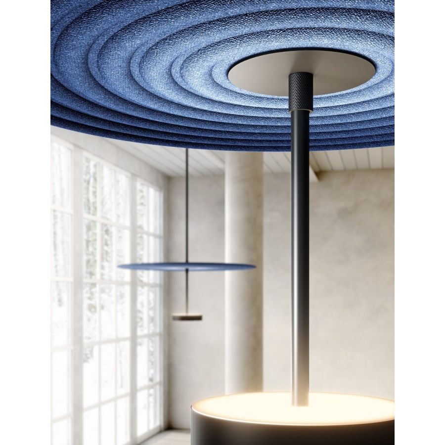 Feel comes from the combination of sound absorbing textile discs and luminous stems. The coloured discs, in matching or contrasting colours, give life to ever-changing configurations, to be suspended from the ceiling in order to absorb noise and improve acoustic comfort.