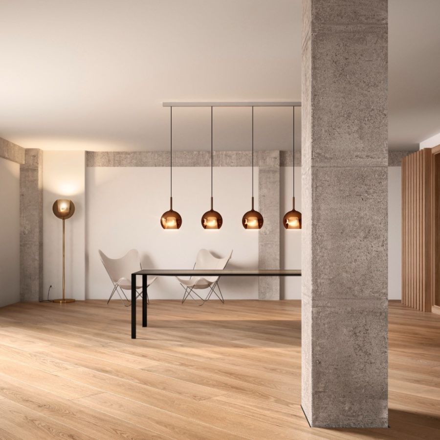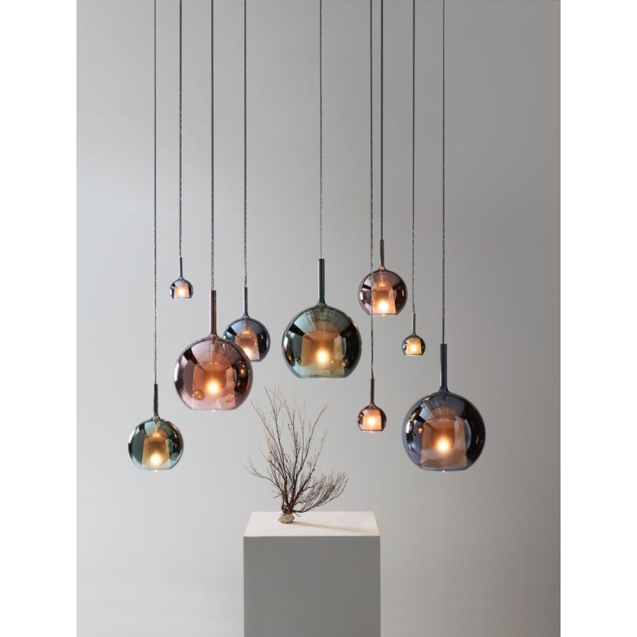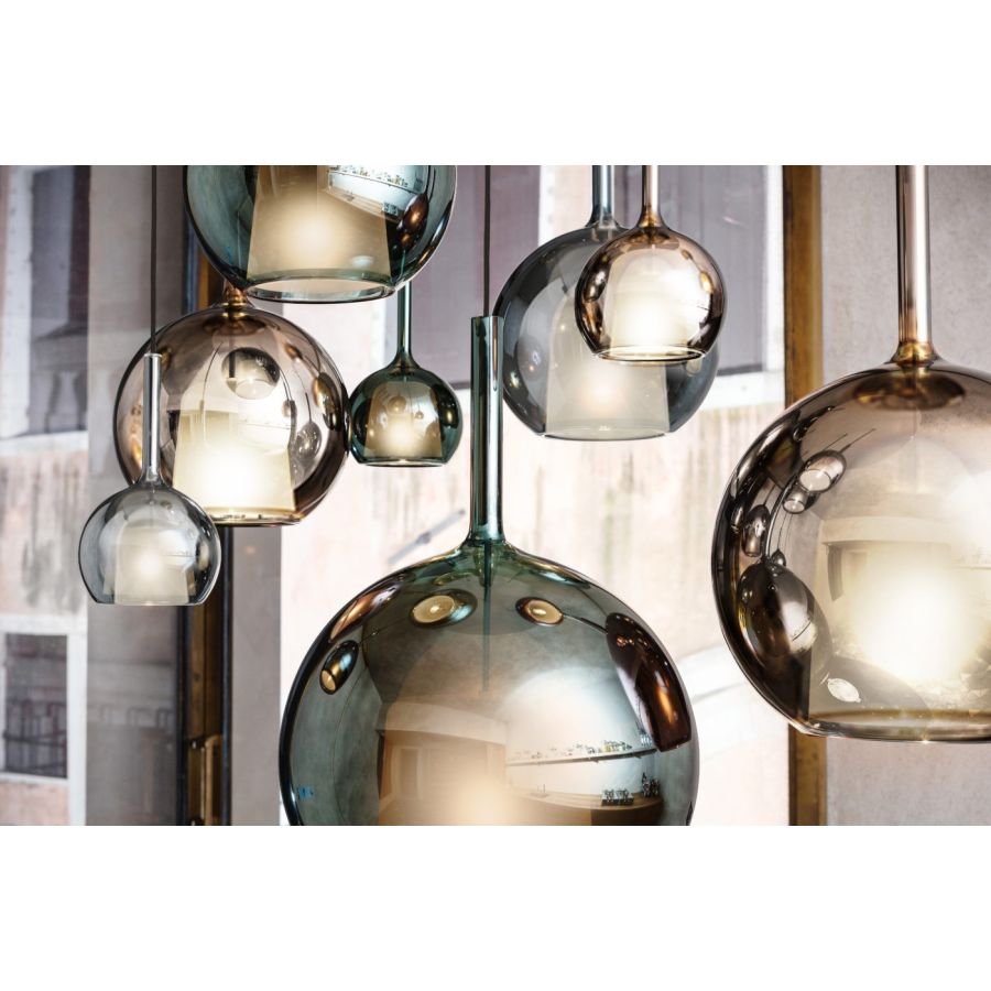 Glo is an icon of our collection, a glass sphere enhancing the glare of light, in a game of reflections back and forth between the lamp and the space or among the very lamps.