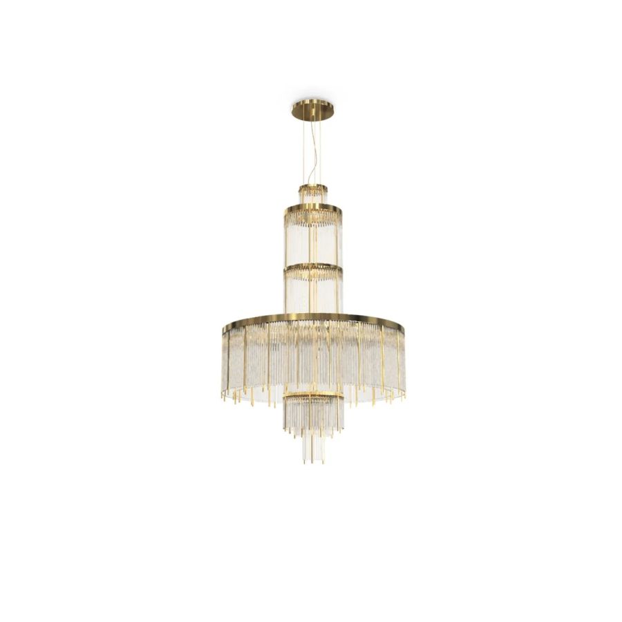 Inspired by the imponent and robust structure of Lighthouses, the Pharo Chandelier represents the rupture of the darkness with an immense and luxurious shine. Made with gold-plated brass and crystal glass, this luxury modern chandelier is the perfect solution for wide spaces, and it’s able to swipe every eye in the room.