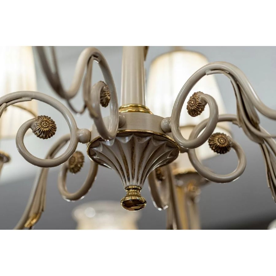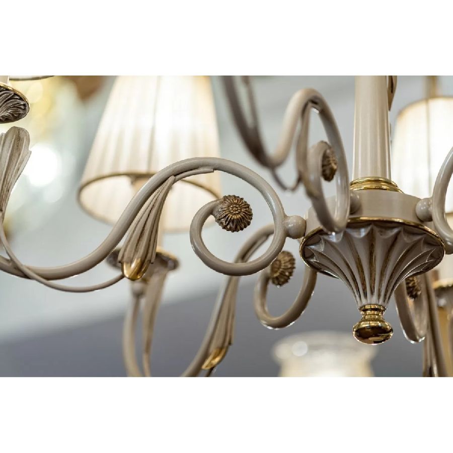 This delightful collection made up of chandeliers, wall lamps and table lamps has a constant decorative element in the shape of a leaf that enriches the arms and the central column and the particular Antique White and Gold finish enhances the details. The combination with organza lampshades in cream color makes it very sophisticated and elegant. Customizable in finishes and sizes.