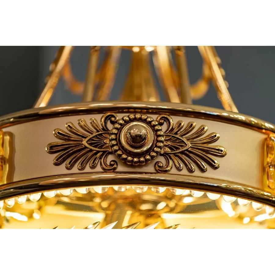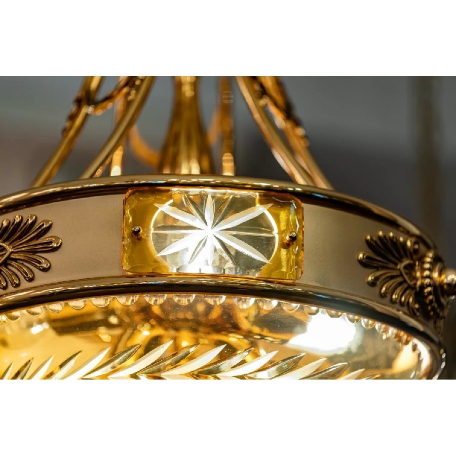 The Amber collection stands out for its beautiful carved crystal. The cups and the details of an intense amber color are further enhanced by the shaded pure gold finish of the brass. Perfect to complete a classic and sumptuous but always contemporary furniture. The models in the 431 collection are supplied with cream-colored pleated organza lampshades.