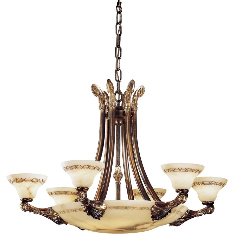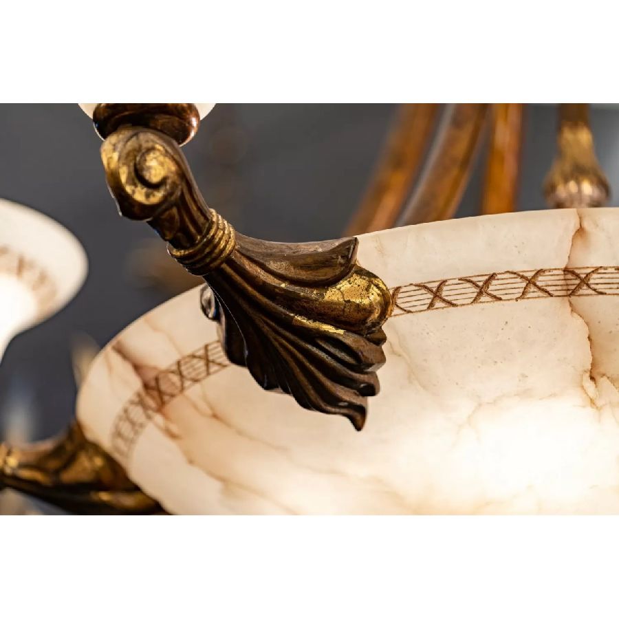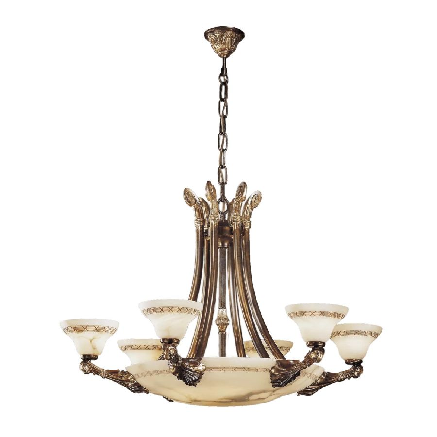 Complete collection of chandeliers, wall lights, table and floor lamps with the combination of brass, presented in Satin or Rust / Gold leaf finish, with antique-colored alabaster and decorated with a delicate motif on the central cups and diffusers.