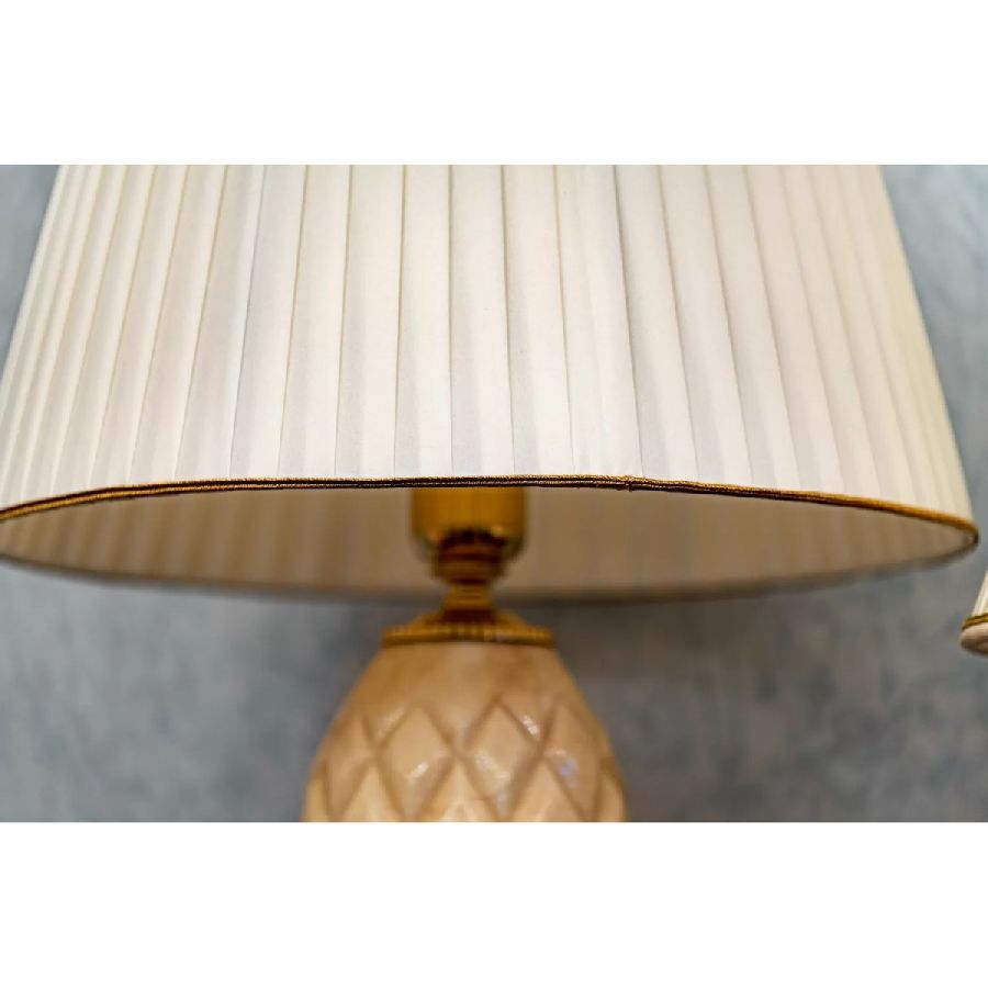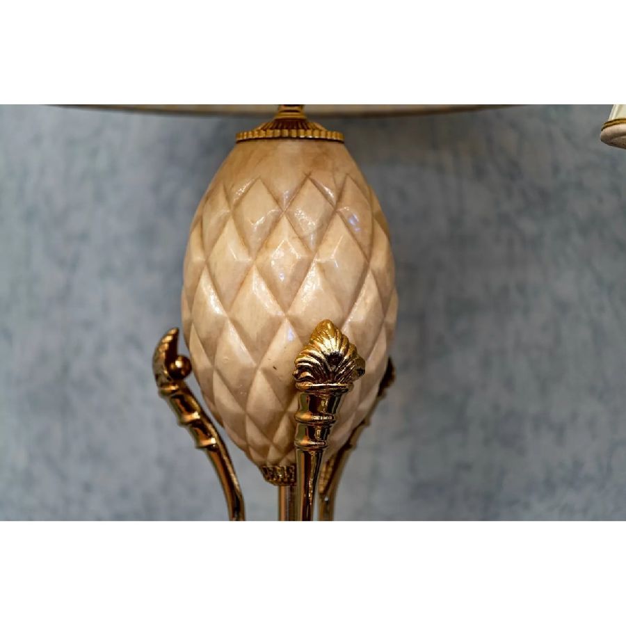 Important Table lamp with carved white alabaster and ivory-colored plissé silk lampshade. Base and details in pure gold finish brass.