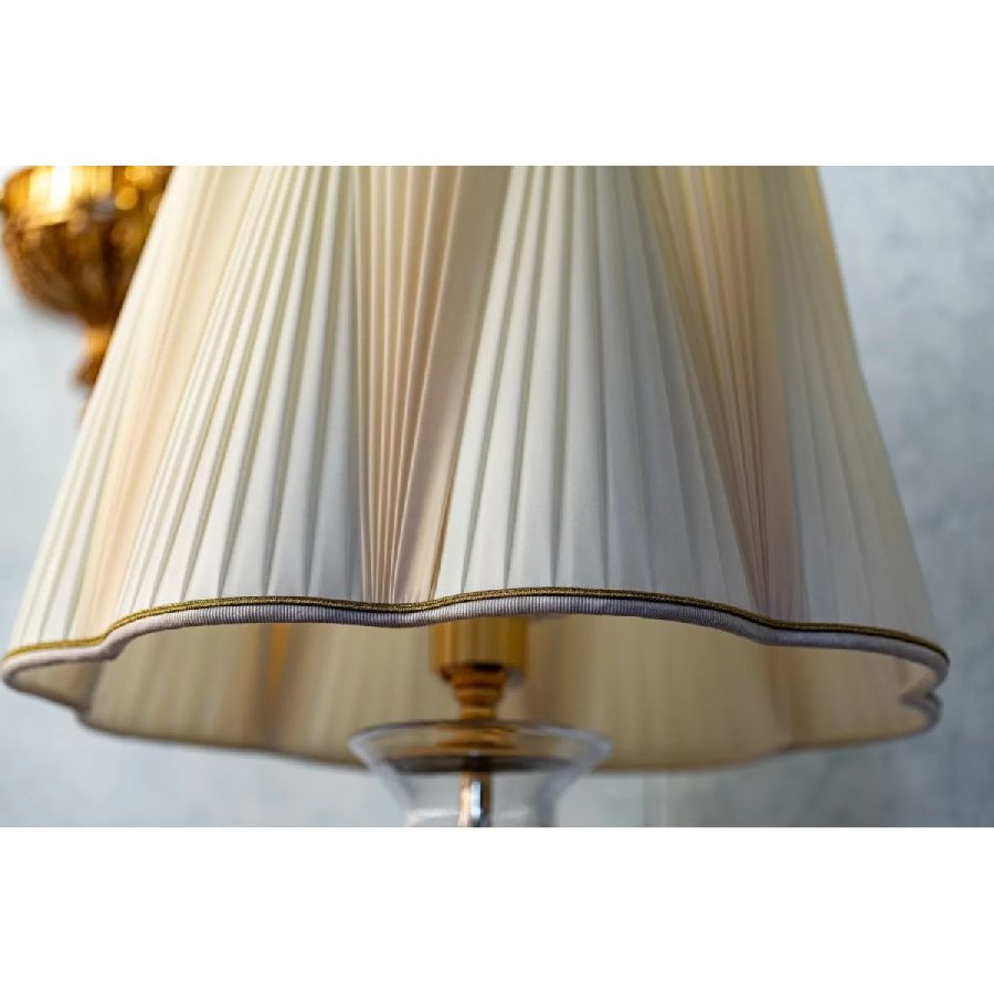 Table lamp with column in transparent crystal decorated with a metal band with floral motif with ivory pleated silk lampshade. Available in pure gold or chrome finishes.