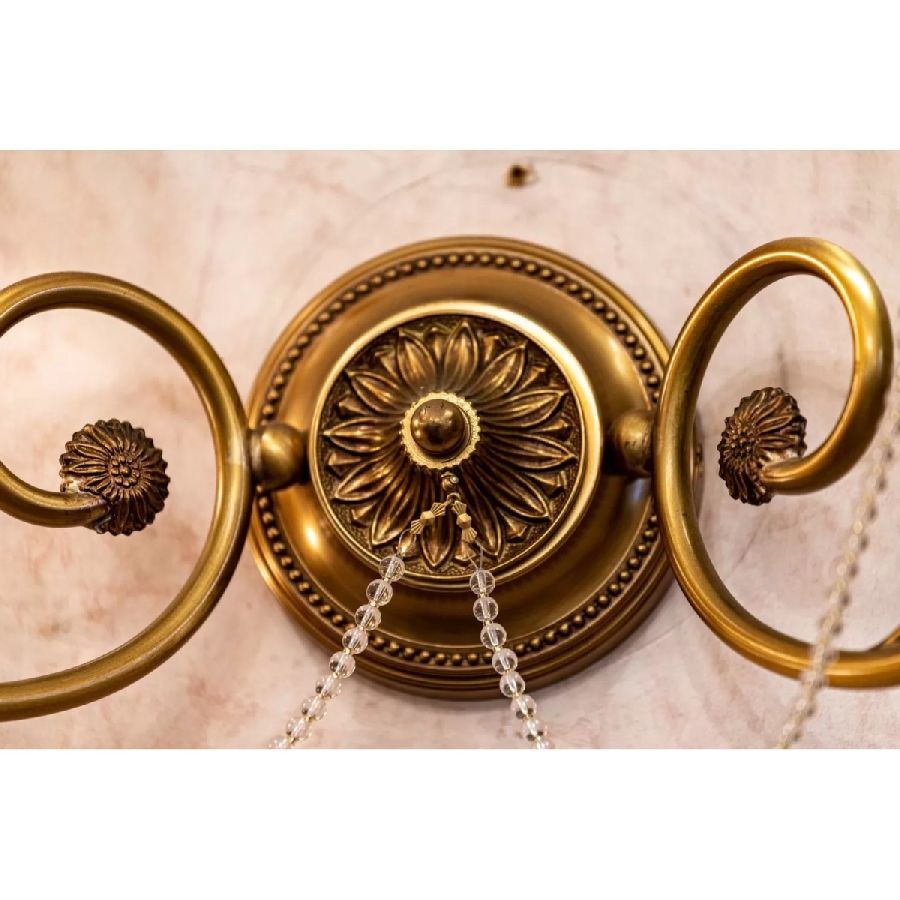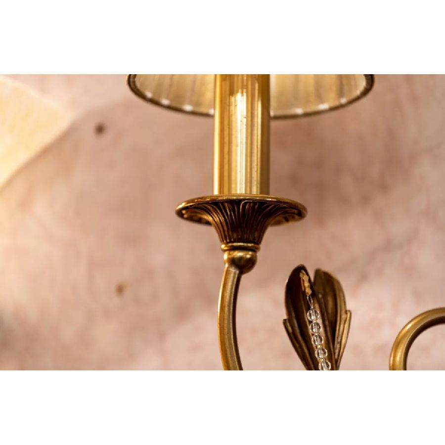 Brass collection in antique French gold finish with crystal drops supported by small daisies, in transparent Schoeler crystal as well, with dove taupe color lampshades. Chandelier and wall lamp can be customized in finishes and sizes.