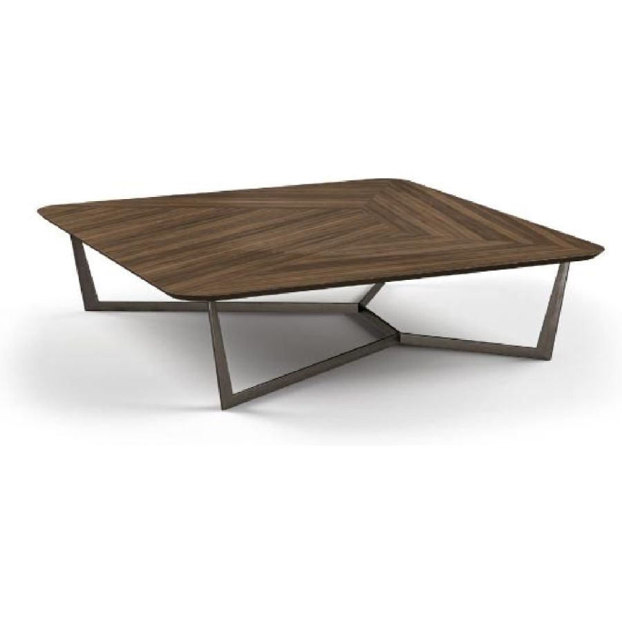 Coffee table with painted metal base. Top available in smoked eucalyptus veneered MDF or marble.