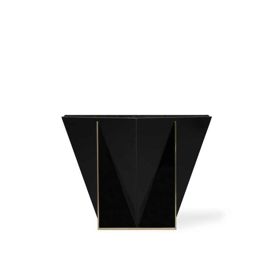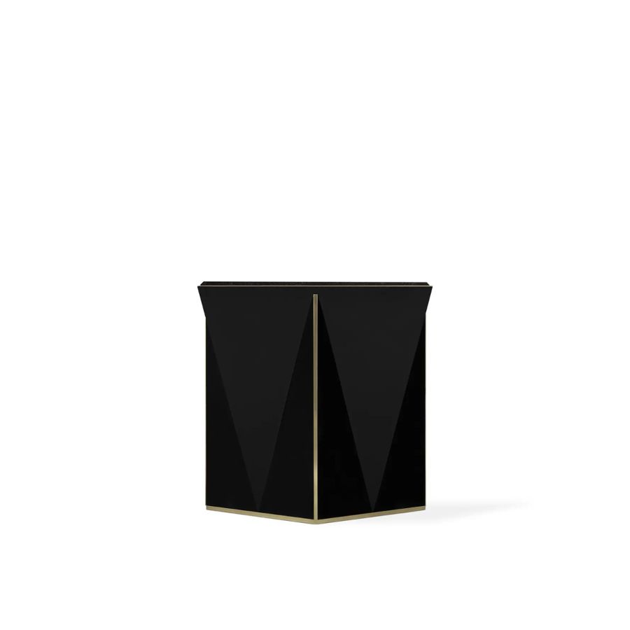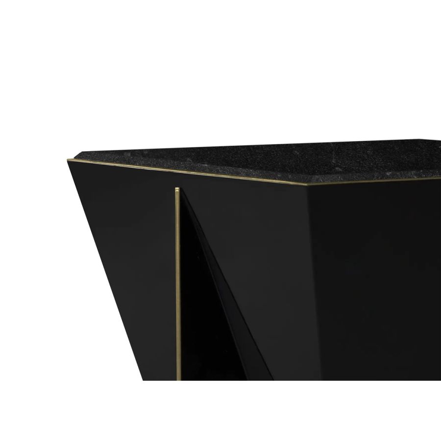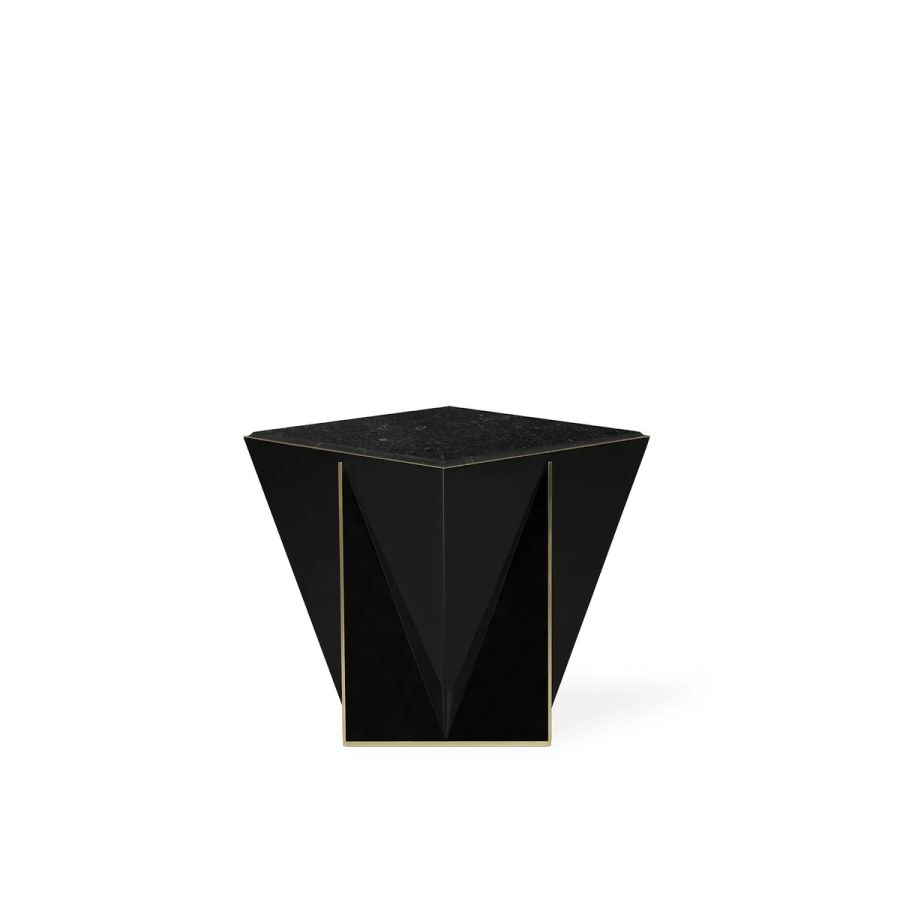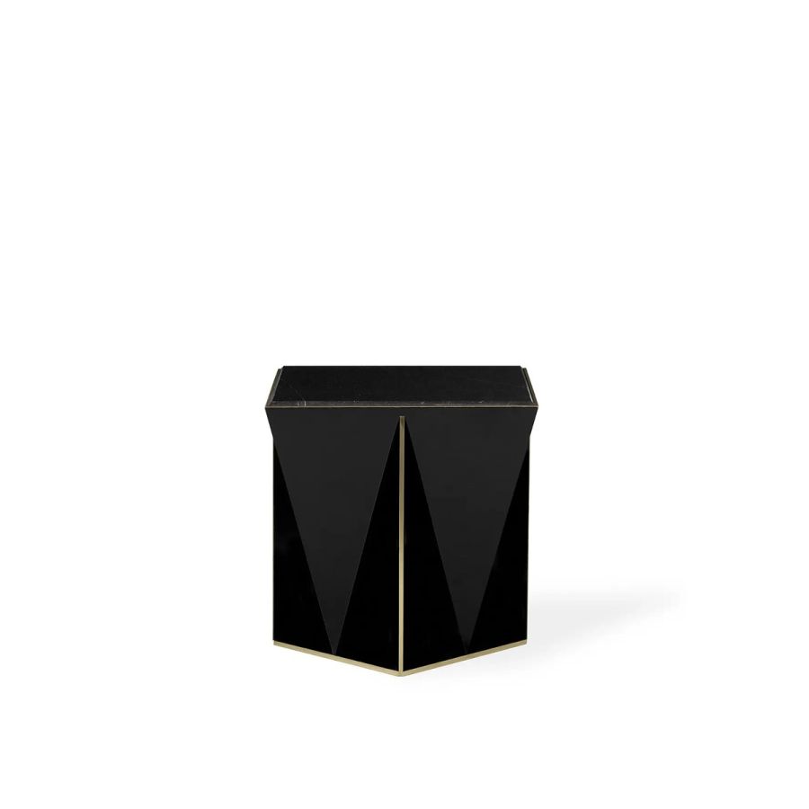 The Prisma Side Table showcases a captivating geometric design that pushes the boundaries of conventional aesthetics. This exceptional piece is meticulously handcrafted using traditional techniques and features exquisite materials such as black lacquer, brass, and Nero Marquina marble. With its unique and mesmerizing form, this black side table has the power to elevate any exclusive environment into a realm of unparalleled luxury and sophistication.