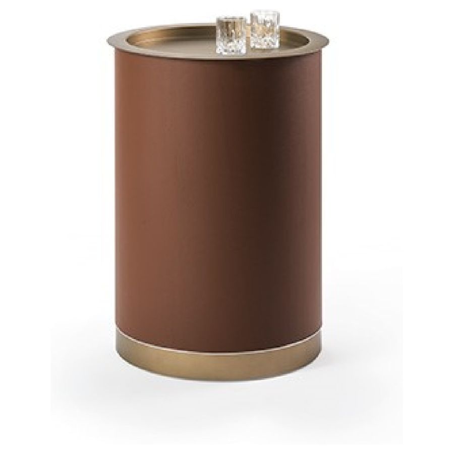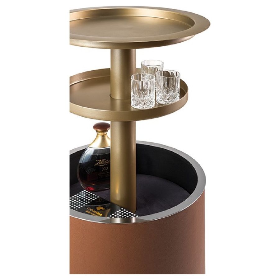 Bar cabinet with a leather-covered structure and interior shelves. Features an electric lifting mechanism controlled by a remote.