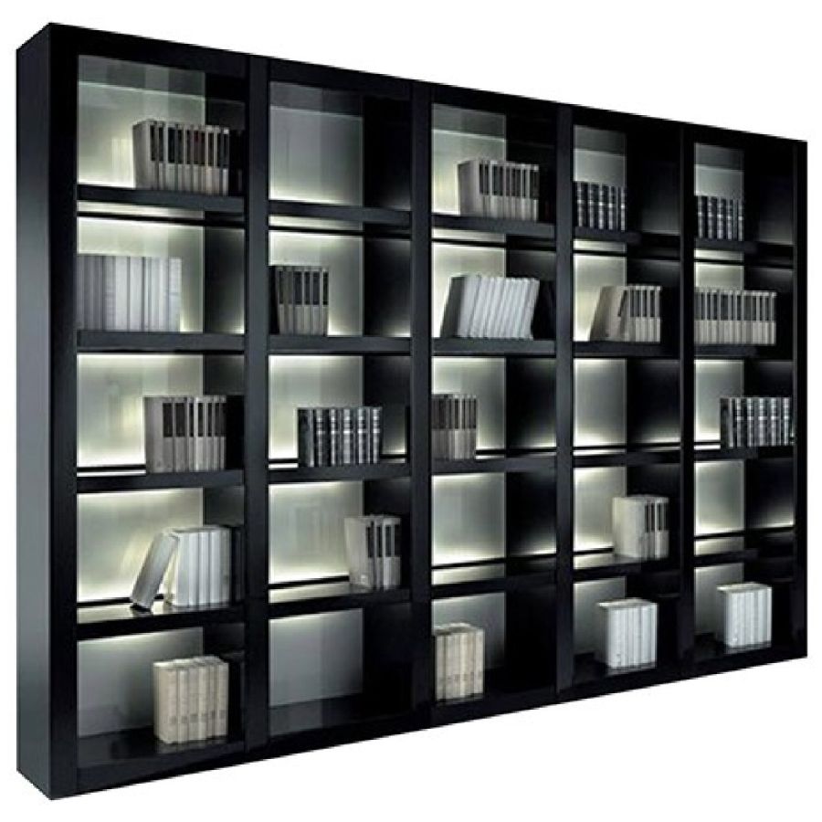 Modular bookcase in shiny lacquered wood with applications in bevelled lacquered glass on the fronts, or in shiny ebony wood. Backs available in white lacquered glass, Antique mirror or in Marble glass. Optional lighting system.