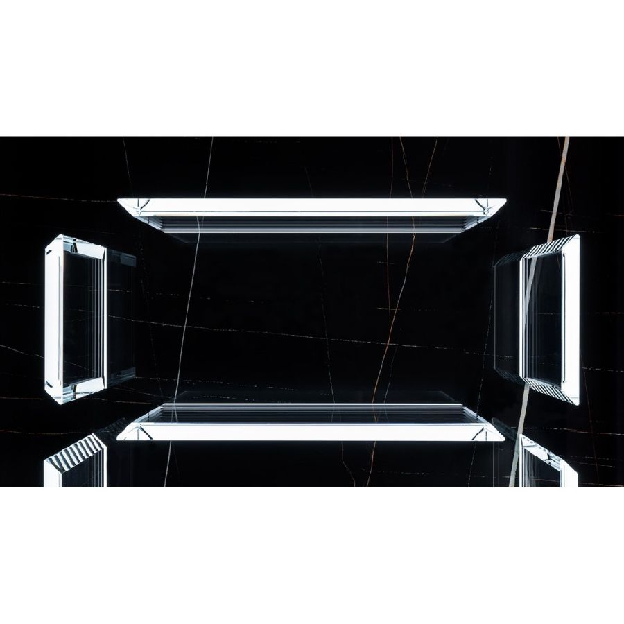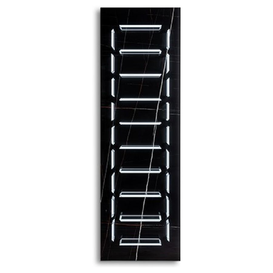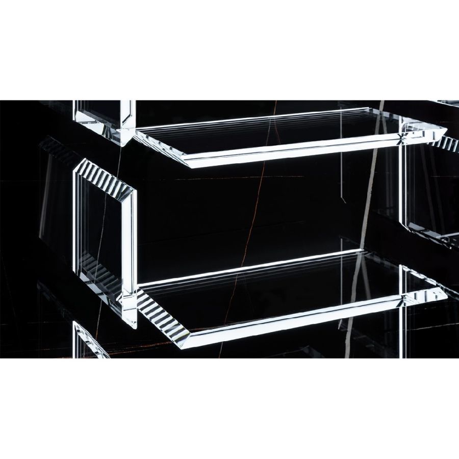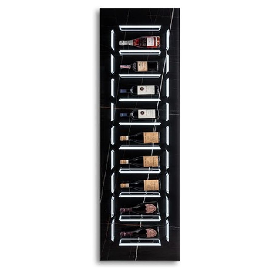 Luminous bookcase made up of a panel in MarmoReflex or LegnoReflex and backlit glass shelves with a prismatic shape. Possibility of having stainless steel bottle holders to transform the luminous bookcase into a wine cellar.