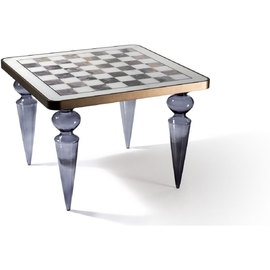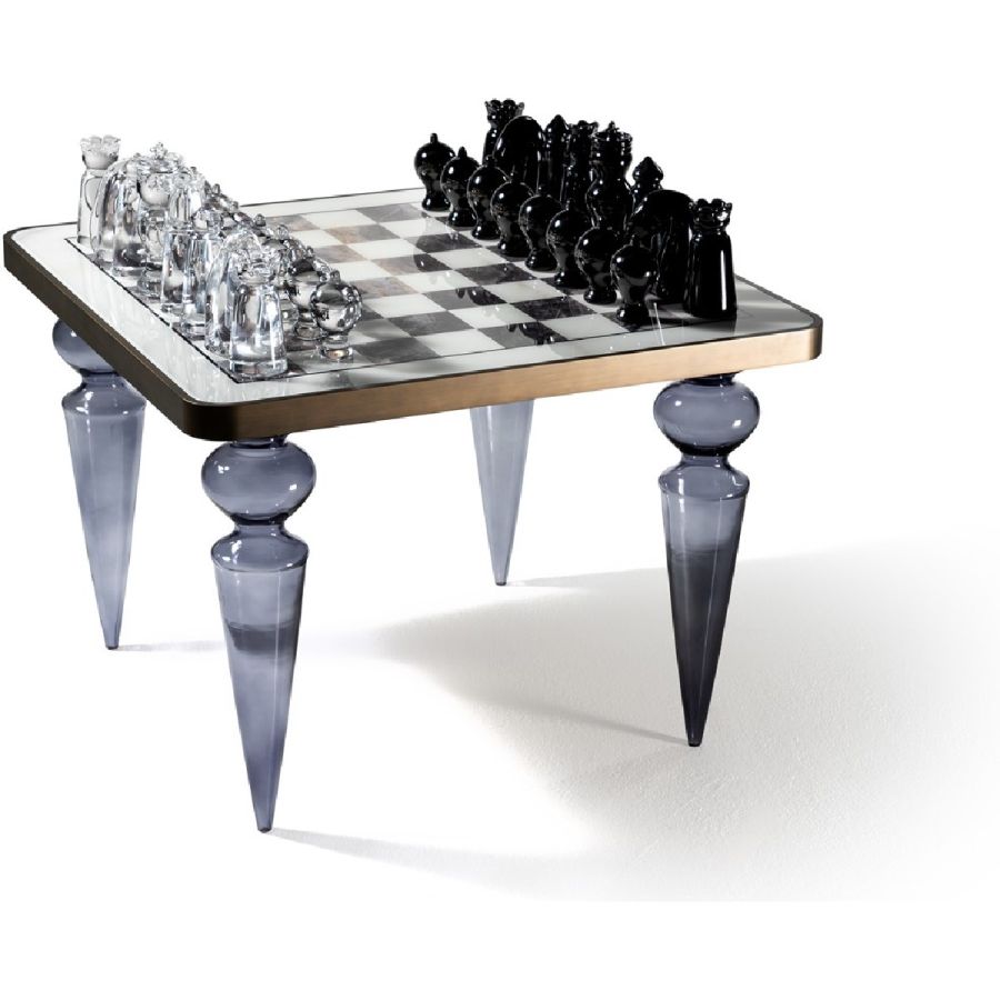 Play-table with Murano glass legs available in smooth finish, clear or coloured or in ribbed finish, transparent or gold. Wooden top with rounded corners in the satin metallic finishes and inlay in Marble glass with chessboard design.
