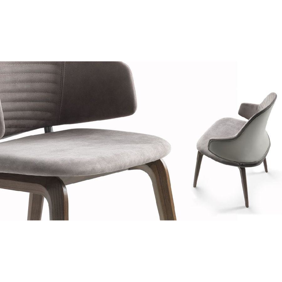 Chair with shell in resin and wood with upholstery in leather or fabric and internal back with quilting. Wooden base in shiny lacquered finish, in Canaletto walnut, bronze or satin brass or titanium finish.