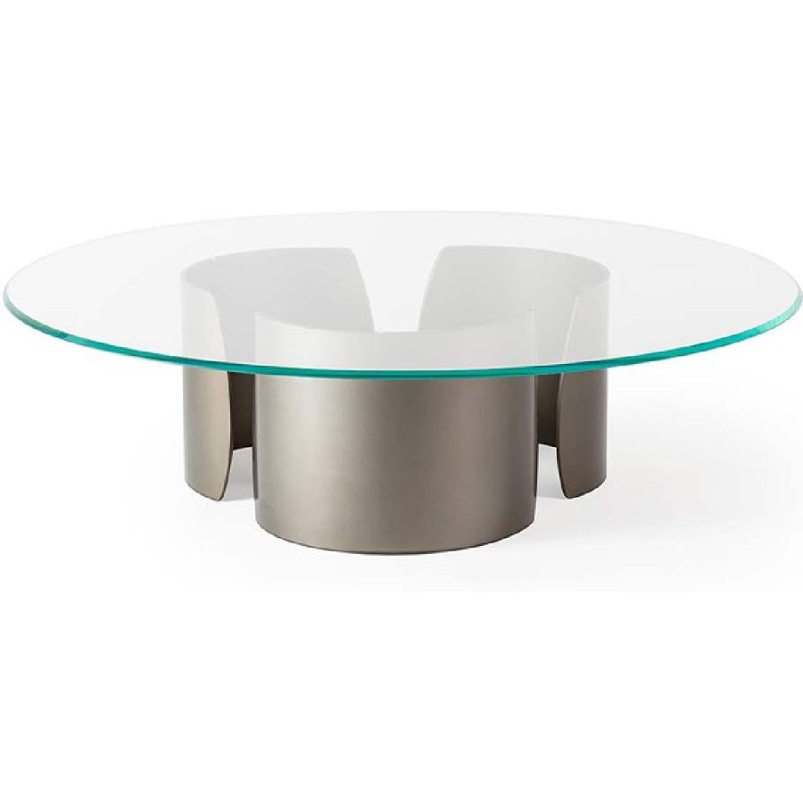 Coffee table with bases in 10mm thick extra-clear curved glass with internal Bronze finishing or in satin brass, dark brass, titanium. Bevelled top in extra-clear or bronze glass, in MarmoReflex or LegnoReflex.