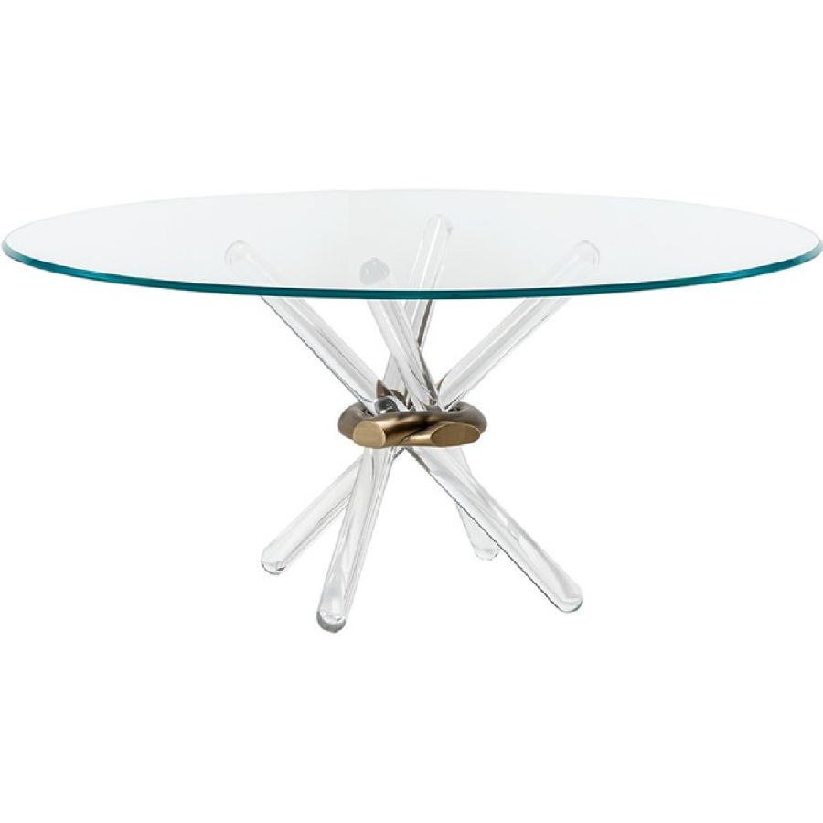 Dining table. Base with legs in smooth Murano glass blue, green, ruby, transparent or white sandblasted. Ring in Murano glass white sandblasted or in wood in Bronze or in brass, dark brass, titanium. Legs also available in ribbed Murano glass transparent, tea, gold or black with ribbed ring in transparent glass or matching the legs. Base avaiable also in Murano glass DECO' finish with blue glass ring.