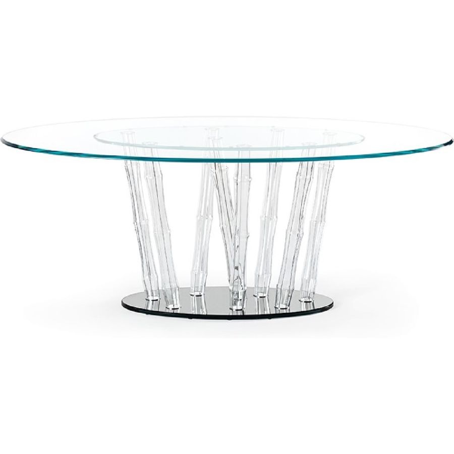 Dining table with base composed by transparent Murano glass tubes with filigree in Tortora colour. Plinth in smoked mirror glass. Extra–clear glass top 15 mm thick
