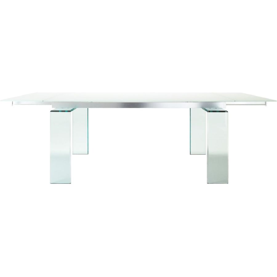 Extension-table with top and extensions in Marmoreflex/Legnoreflex glass. Aluminium structure, brushed finish. Legs in extra-clear 15mm thick glass, transparent or in brass, dark brass, titanium finish.