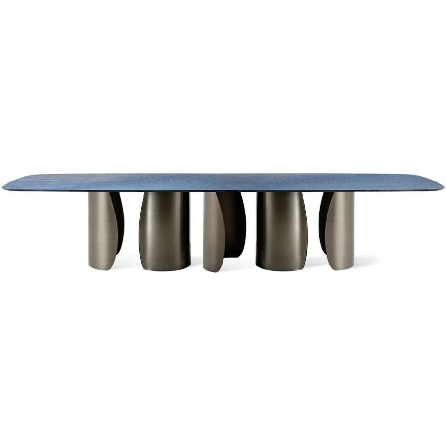Dining table with bases in 10mm thick extra-clear curved glass with internal Bronze finishing. Top in MarmoReflex. Custom dimension: 400 x 140 x 74h cm