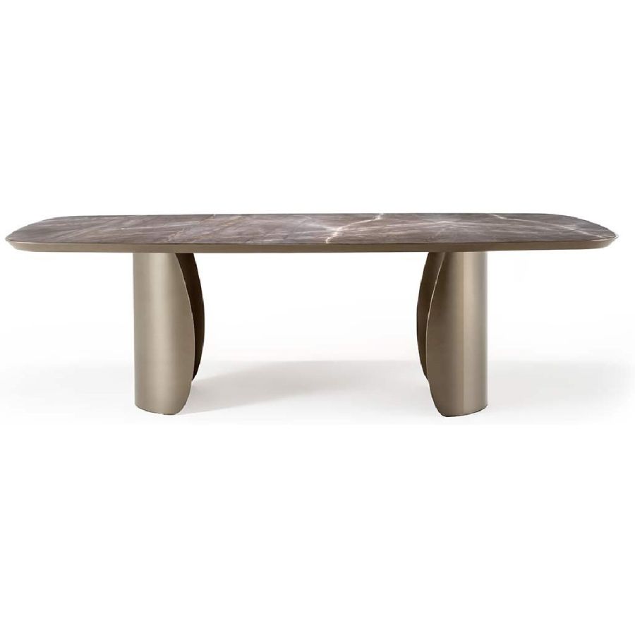 Dining table with bases in 10mm thick extra-clear curved glass with internal Bronze (100M) finishing or in satin brass, dark brass or titanium. Top in clear glass, extra-clear glass or in MarmoReflex or LegnoReflex. Also available with Bevel Wood top in Canaletto or Canaletto Henné or with Bevel MarmoReflex top.
