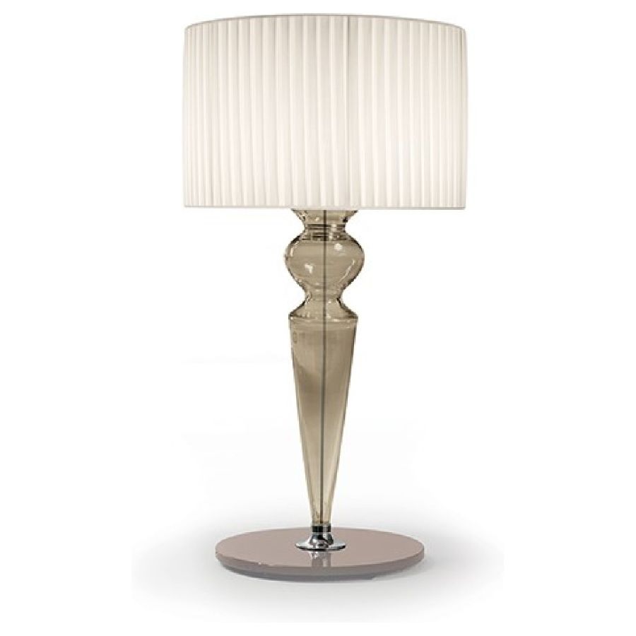 Table lamp in smooth Murano glass transparent or in various colours. Base in transparent, mirror or lacquered glass Lampshade in ivory pongé fabric. Led buld.