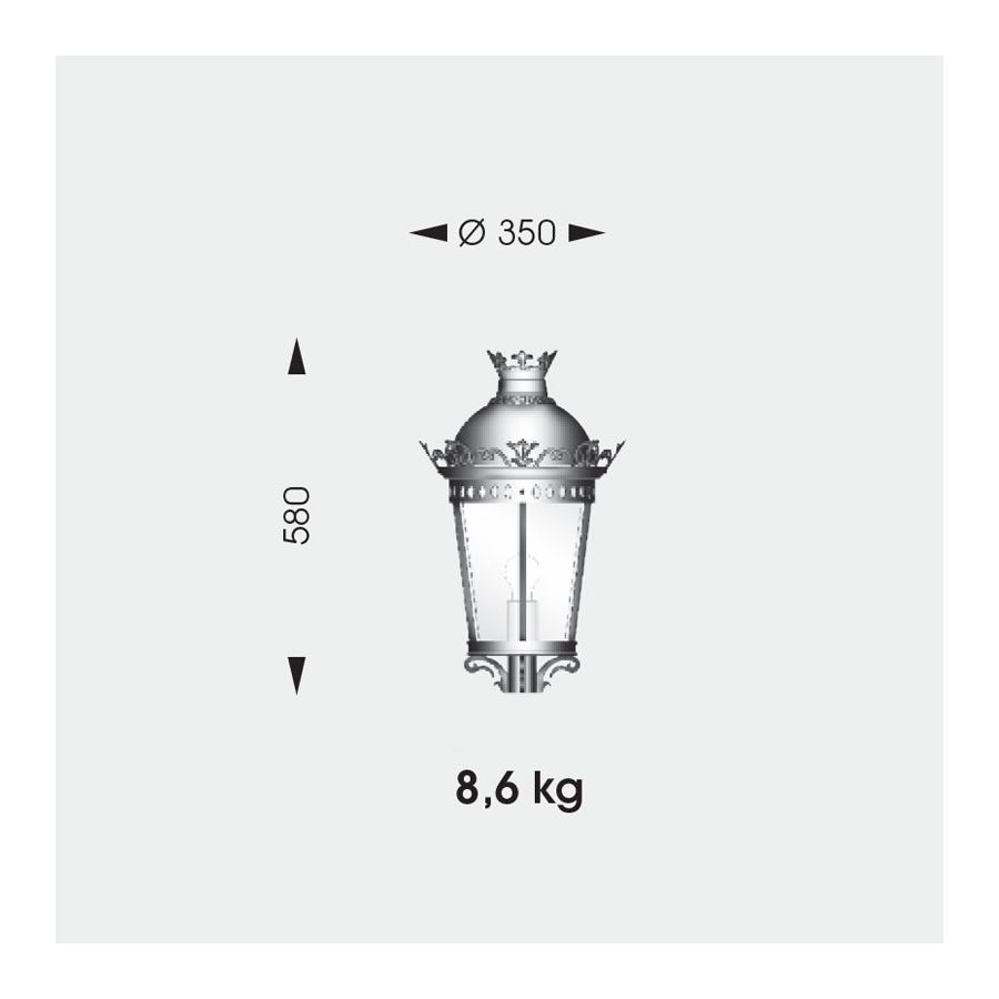 Ta lampa na cokole firmy Robers (Niemcy) została zaprojektowana w prawdziwie wiktoriańskim stylu z elementami gotyckimi. Jej klosz to tradycyjna latarnia ozdobiona elementami kwiatowymi wokół obwodu dachu. Cylindryczna rama chroni klosz z dmuchanego szkła w antycznym wykończeniu. Wyposażona jest w dolny uchwyt na żarówkę. Okrągła podstawa podtrzymuje krótką, skromnie zdobioną kolumnę. Włącznik zaprojektowano jako łodygę kwiatu z płatkami.