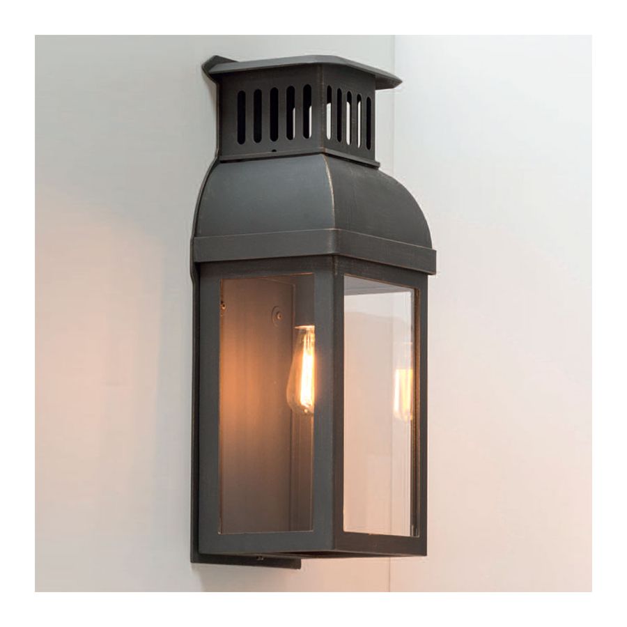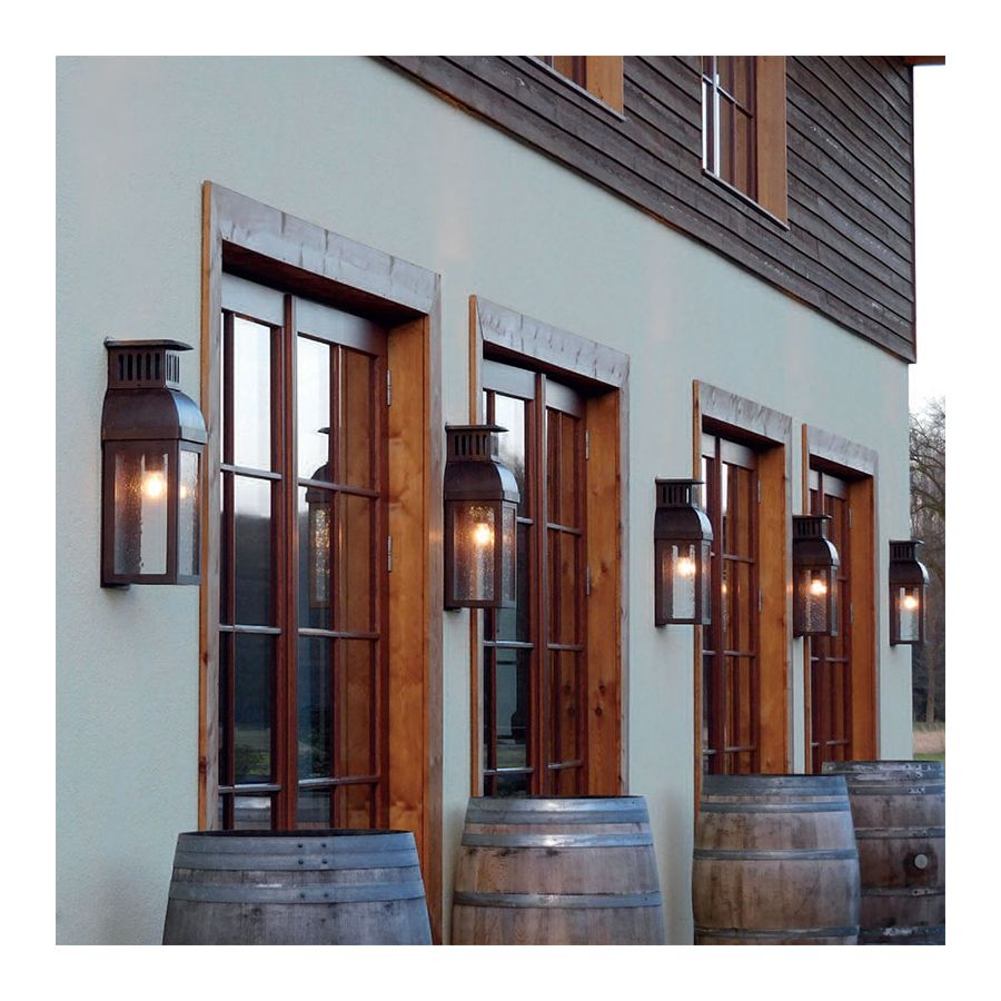 Ta lampa ścienna w tradycyjnym stylu latarni zachwyca nową wizją pochodzącą od marki Robers (Niemcy). Główną cechą jest daszek z małą nasadką wentylacyjną, w której całą powierzchnię zajmują otwory wentylacyjne, pełniące jednocześnie rolę dekoracyjną. Rama i podstawa latarni utrzymane są w skromnym stylu: z regularnymi liniami geometrycznymi prostokątnej ramy i lekko zaokrąglonymi krawędziami podstawy. Do klosza użyto dmuchanego szkła o przezroczystym wykończeniu. Lampa posiada górne mocowanie.