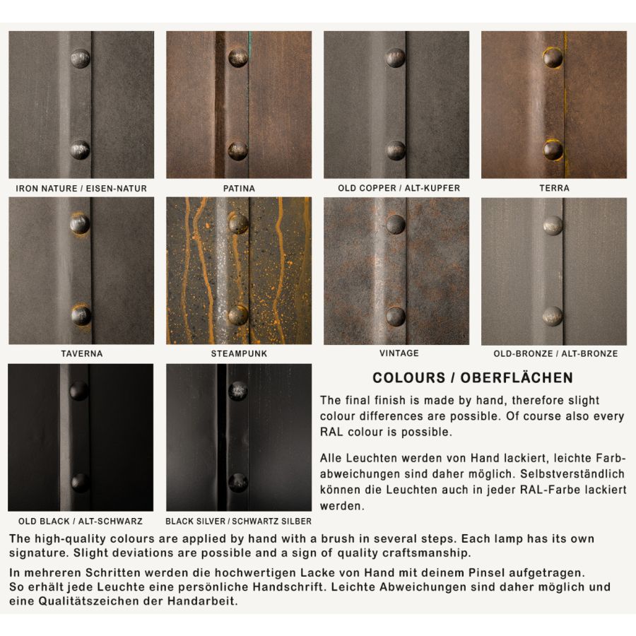 Ta lampa wisząca niemieckiej marki Robers ma klasyczny styl kandelabru. Pierścień podstawy, tuby świecowe, kielichy świec, łańcuchy oraz podsufitka wykonane są z kutego żelaza ręcznie przez kowali producenta w jego zakładzie w Niemczech. Każda świeca wyposażona jest w żarówkę i jest połączona z pierścieniem podstawy elegancką rurką zwieńczoną małym ozdobnym zakończeniem. Wszystkie cztery szklane świece umieszczone są równomiernie na pierścieniu podstawy, podobnie jak reflektory skierowane w dół dokładnie pomiędzy każdymi dwoma świecami. Lampa posiada własną podsufitkę, cztery ramiona-haki i jest połączona z górną podsufitką za pomocą haka. Kowale pracują nad wykończeniem podstawy, oferując 10 różnych opcji. Za każdym razem efekt może się różnić ze względu na ręczny sposób obróbki.