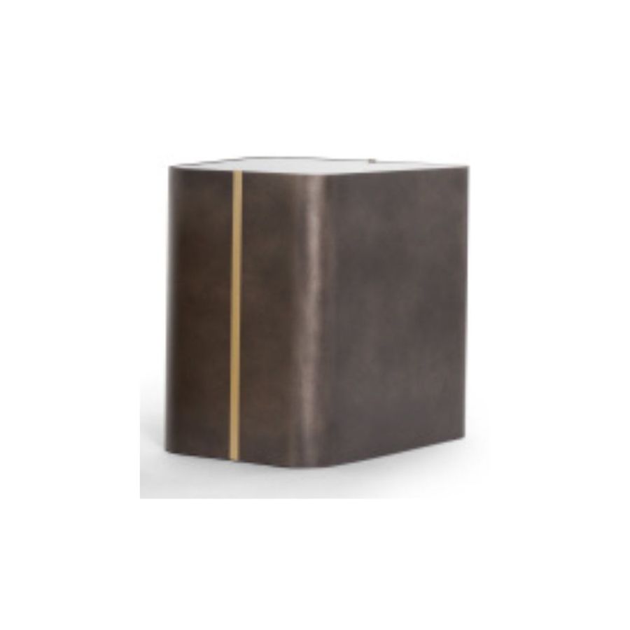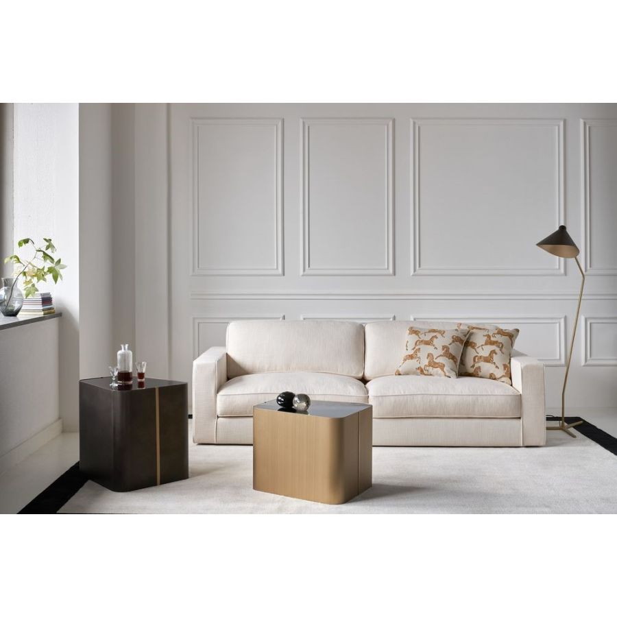 Blat ze szkła białego lub czarnego albo blat lustrzany. Konstrukcja i metalowa opaska są dostępne w różnych metalowych wykończeniach: lakierowane na czarno/biało, satynowy mosiądz, brąz, cyna.