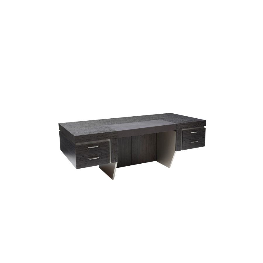 Matt rosewood or matt tobacco rosewood desk, 4 drawers, extractable top in leather or “MicroNabuk” finish, glazed effect steel details.